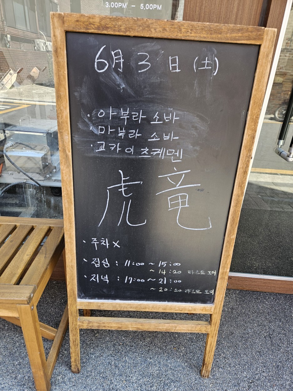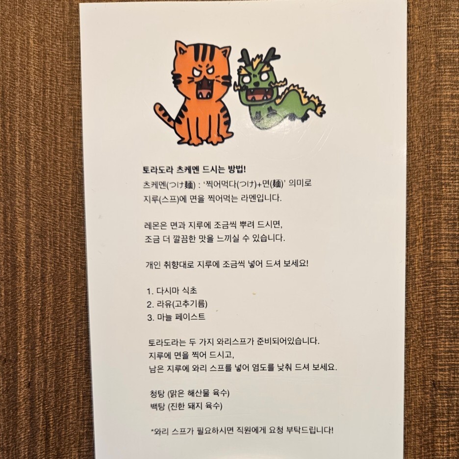 토라도라는 기본적으로는 츠케멘이 주메뉴이다. 하지만 가끔 아부라 소바나 쿄가이 라멘, 돈코츠 라멘 등 다양한 메뉴를 선보이기도 한다. 이날도 아부라 소바를 추가로 먹을 수 있던 날이다. 평일 점심시간에는 꽤 웨이팅이 있는 것으로 알고 있다. QR 코드로 대기 순서를 안내 받을 수 있다.