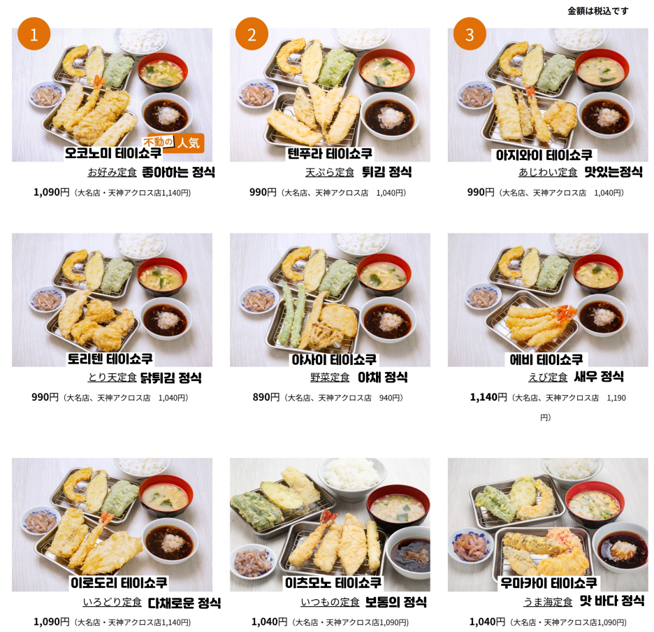 - 튀김 정식 (天ぷら定食 텐푸라 정식): 1,040엔