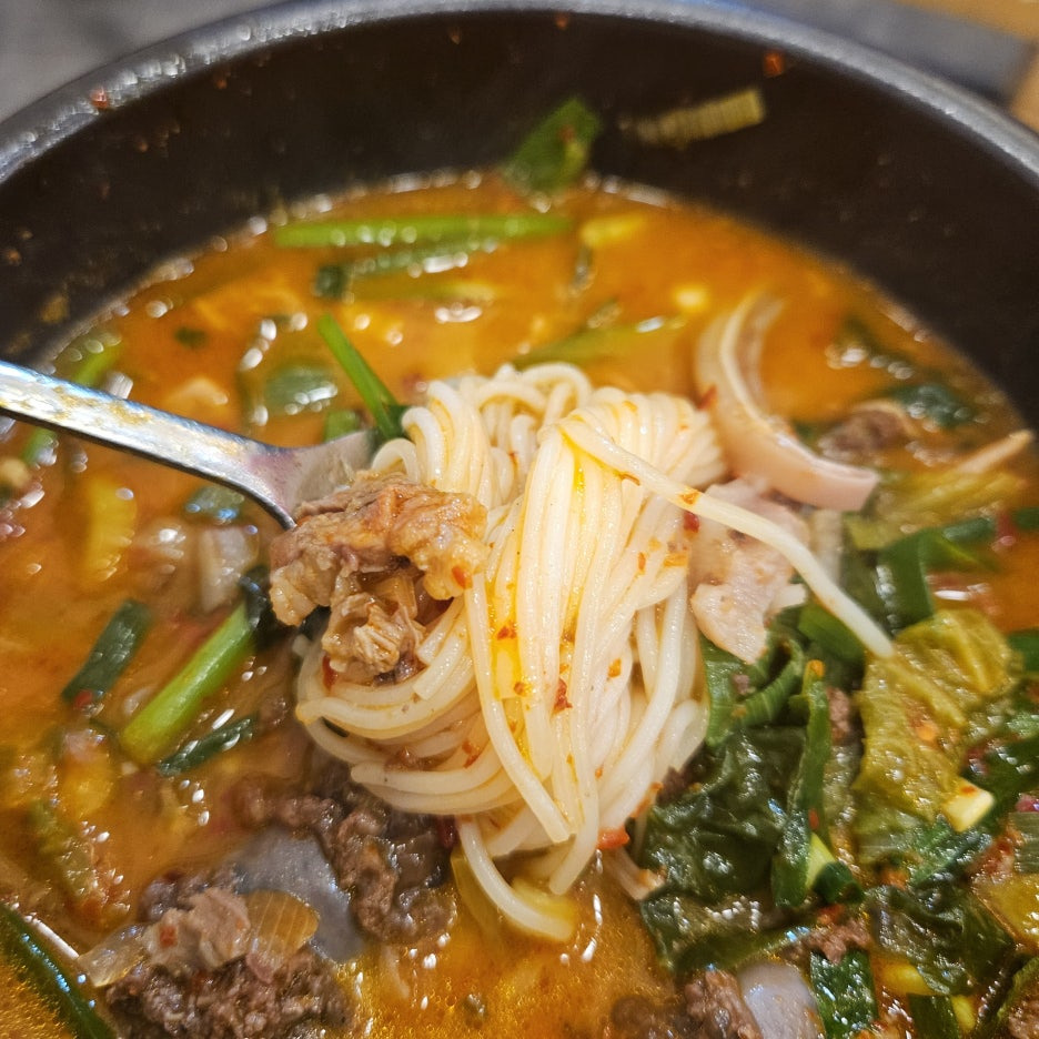 얼큰이라는 이름이 붙어있지만 맵다기보다는 고급 양념이 들어가 조금은 더 깊은 맛이다. 국물은 진한 느낌으로 조금 더 끈적거린다.