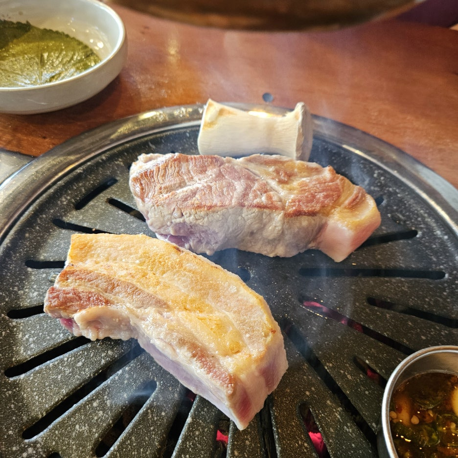 삼겹살이 아주 잘 구워지고 있다. 색이 곱다.