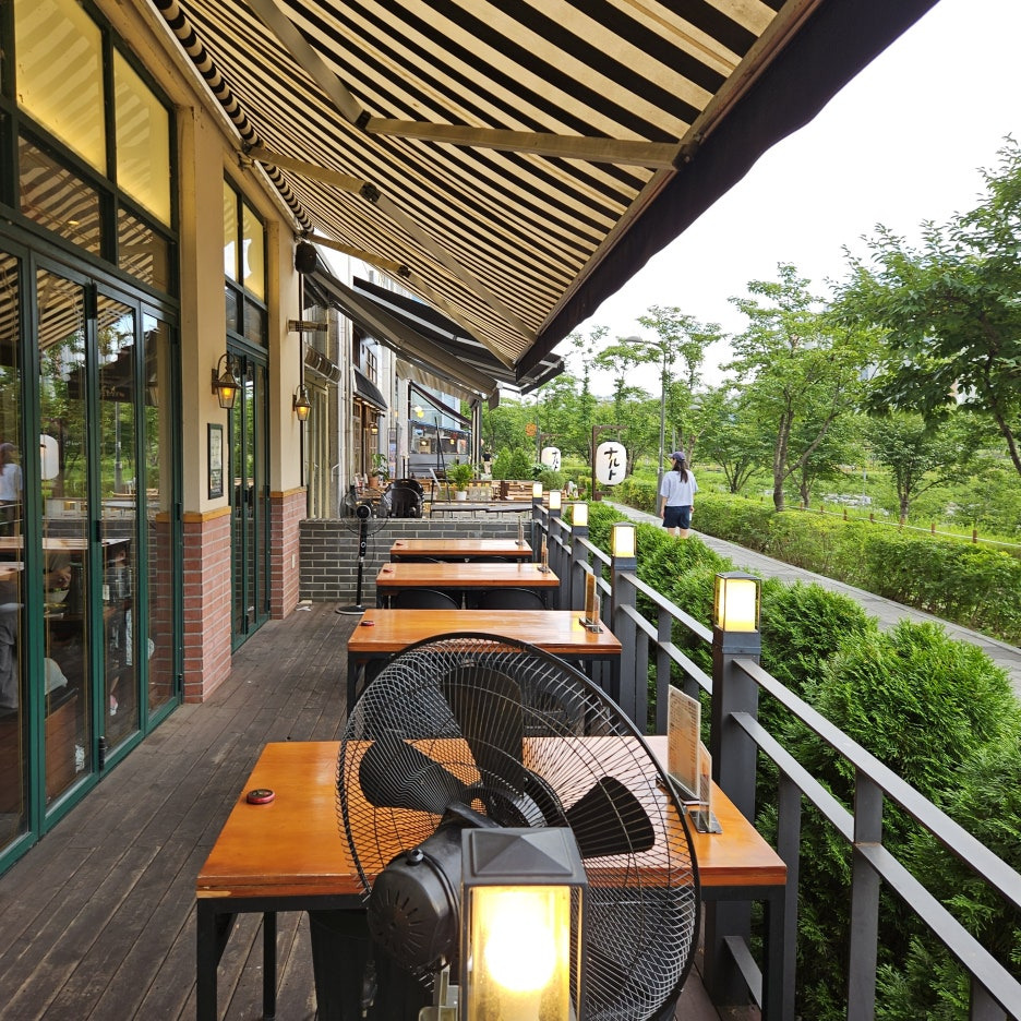 외부에도 이런 테라스 좌석이 있다. 지금같은 여름에는 완전 불가능이겠지만, 조금 선선해지는 가을이나 봄에는 호수 공원을 바라보면서 고기를 먹을 수 있다면 그것도 좋을 듯. 그런데, 테이블에 화구가 없는 걸로 봐서는 가능한지는 모르겠다.