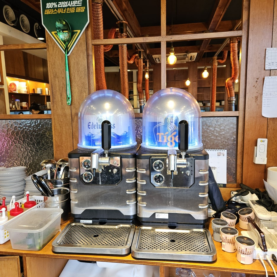 놀라웠던 것은, 생맥주 기계가 무려 3개나 있었다는 것. 하이네켄, 에델바이스, 타이거로 종류가 다양했다.