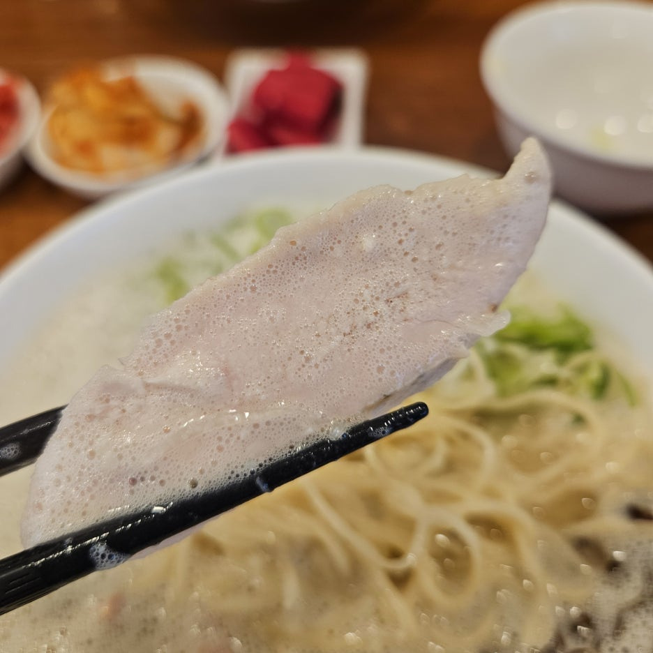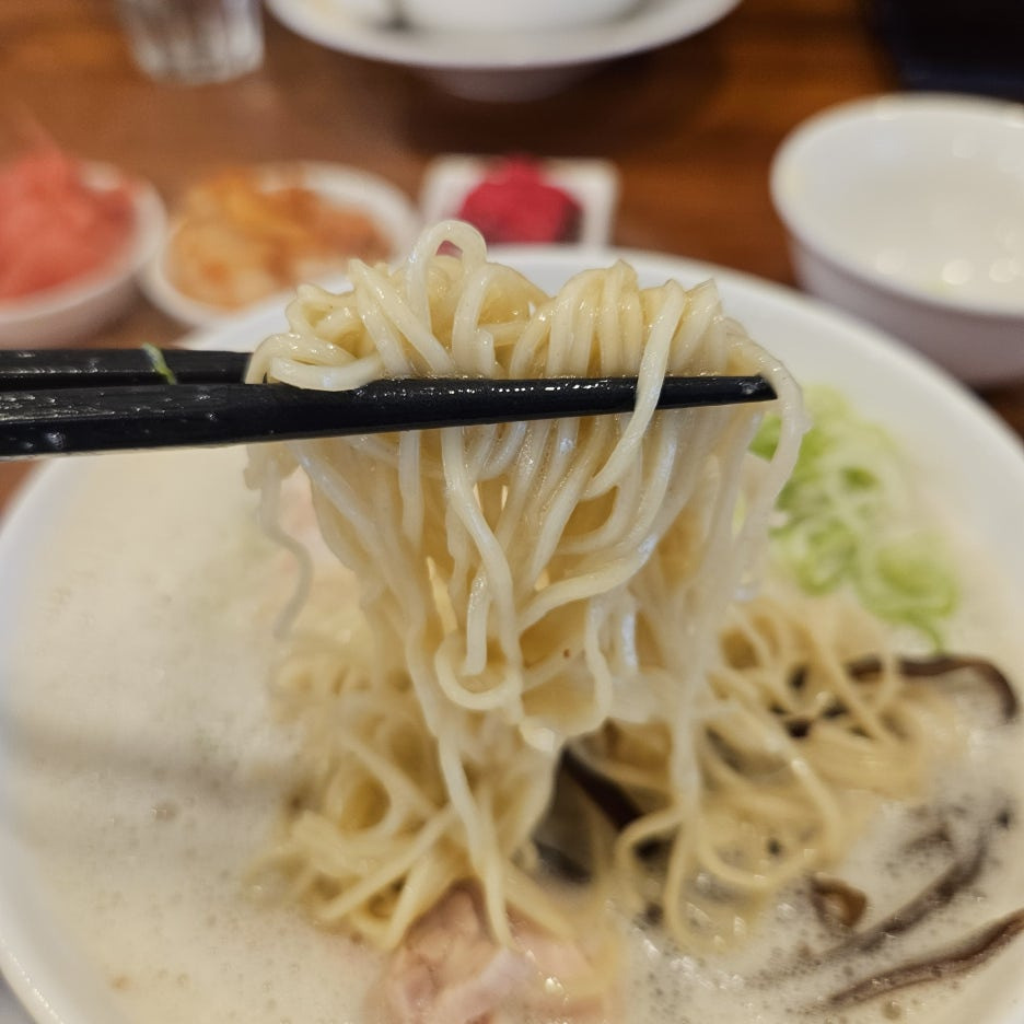 가느다란 면발은 쫄깃함이 살아있다. 일본에서 라멘을 주문할 때 카타메(꼬들한 면)로 주문할 때와 완벽하게 동일. 이게 처음에는 꼬들꼬들한 면발이지만, 먹다 보면 국물의 열기로 익어 나중에는 부드러운 면으로 먹을 수 있게 된다.