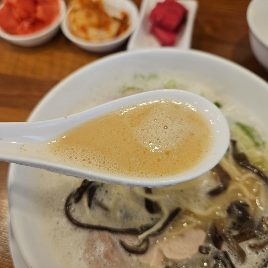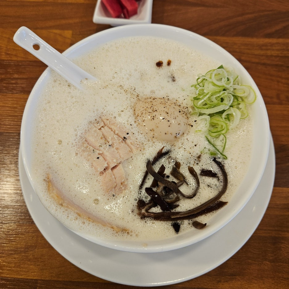 새하얀 색의 닭고기 수프로 만들어진 라멘. 위쪽은 부드러운 거품으로 가득 차있다.