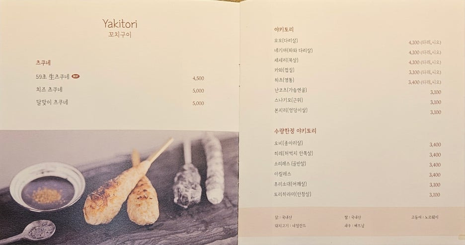 간단하게 살펴보는 메뉴. 그리고 우리는 3꼬치 코스로 시작하기로 한다.
