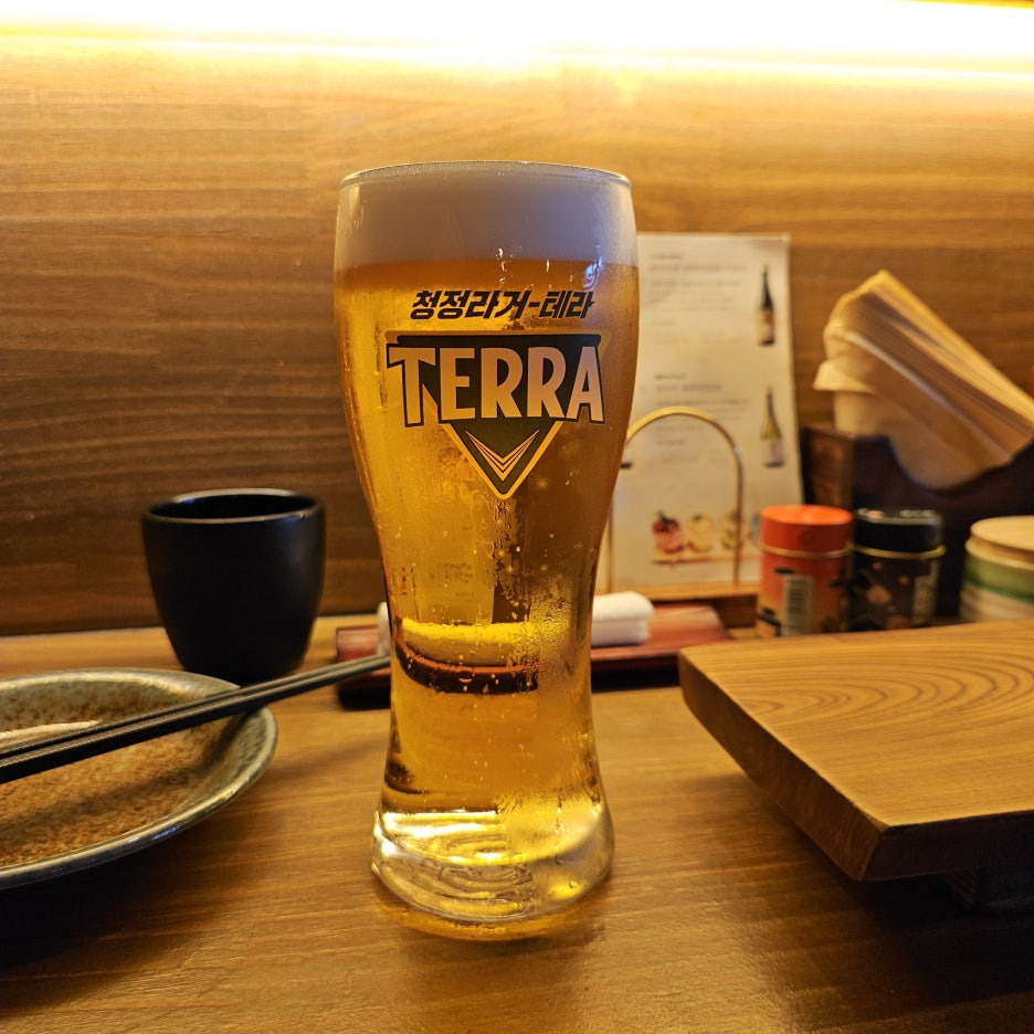 먼저 나온 생맥주. 워낙 더웠던 날이라 바로 갈증을 해결하기 위함. 평소 일본 생맥주를 아주 즐겨마시지만, 이곳에서는 항상 국내산 생맥주를 마신다. 특히, 오늘의 테라 생맥주는 아주 훌륭하다. 시원하기도 했지만 무엇보다도 고소한 맛이 좋았다. 아마도 첫 잔이라 더 그런 것일지도.