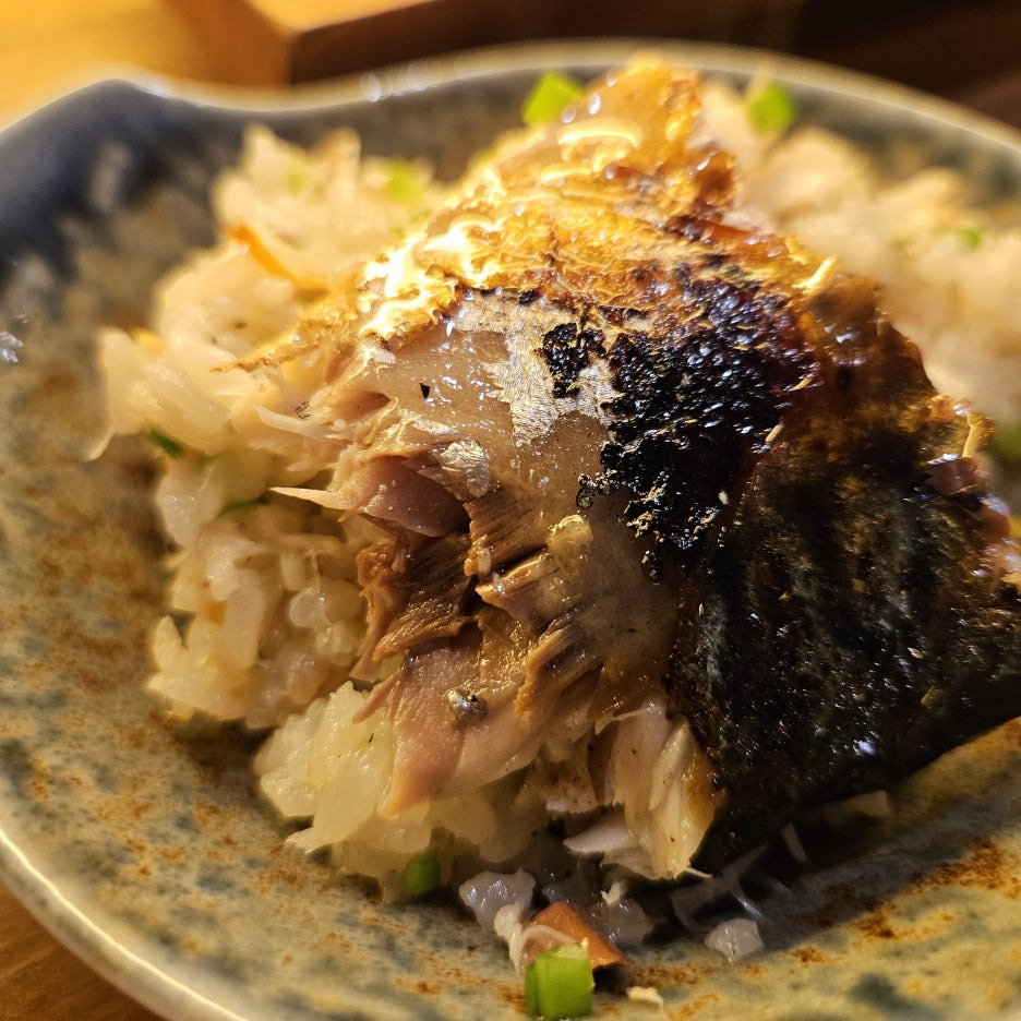 30분 정도 걸리는 메뉴라, 꼬치 코스를 주문할 때 미리 주문을 한 고등어 가마솥 밥. 큰 고등어 두덩이가 들어가 있고, 아래는 잘 지어진 솥밥.