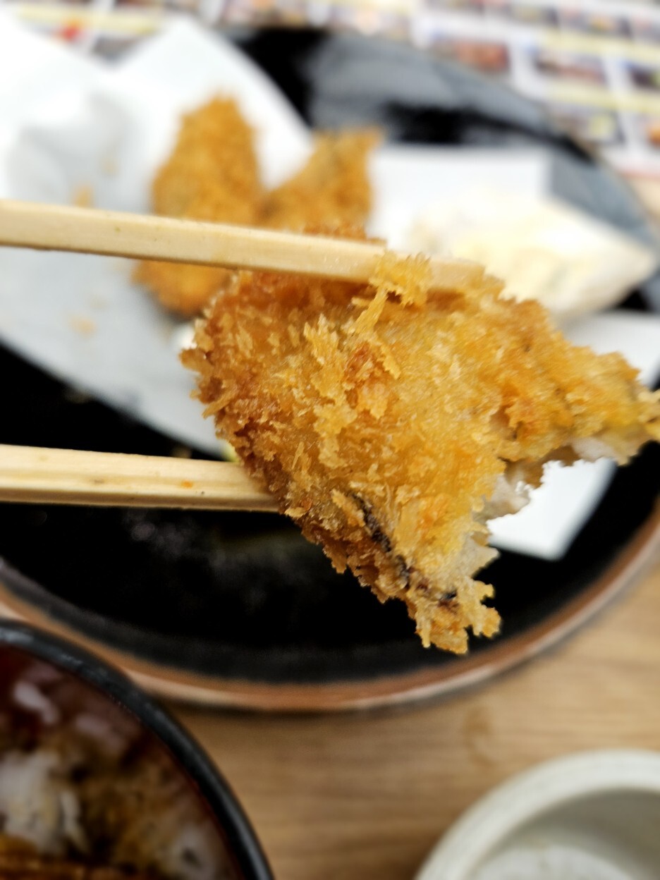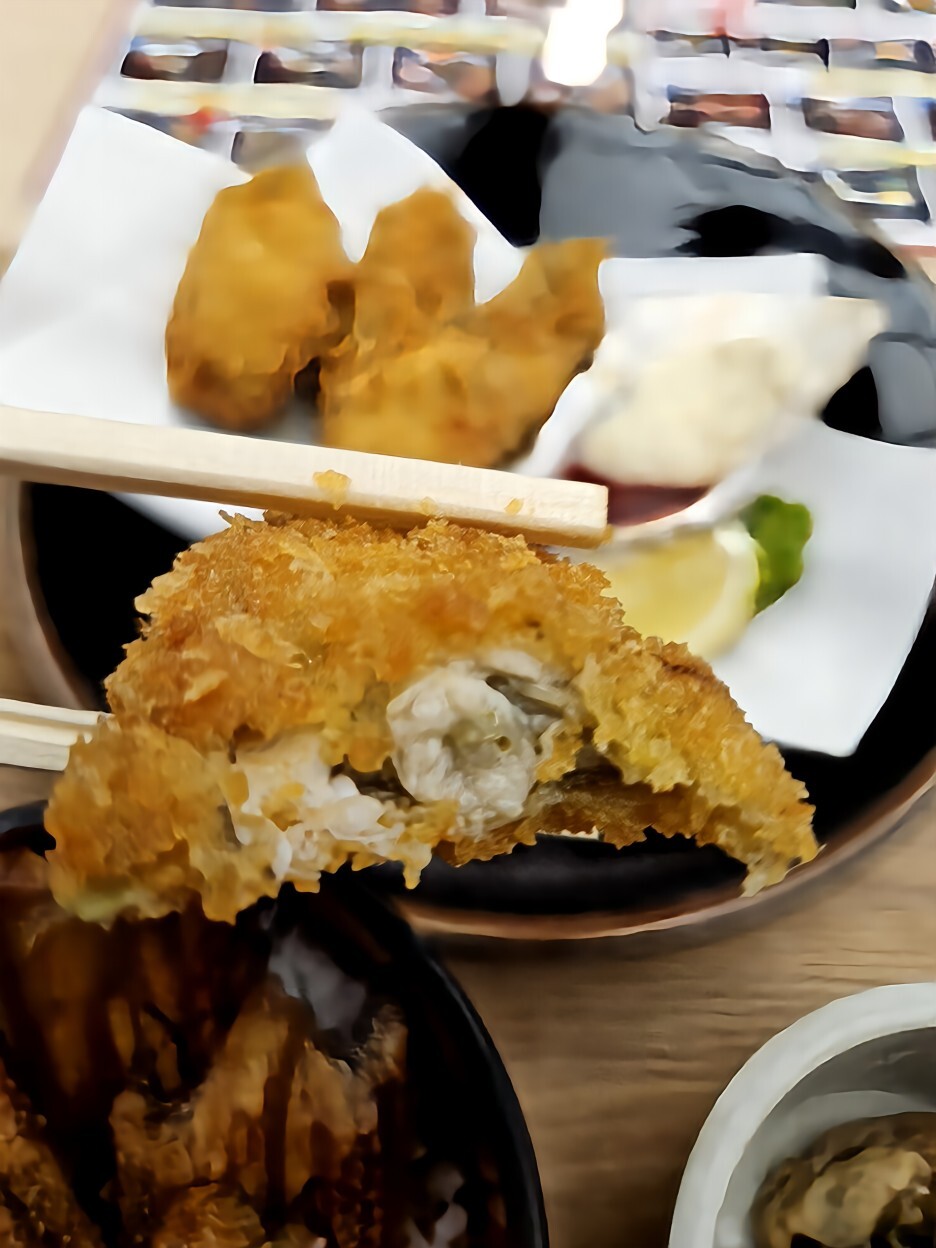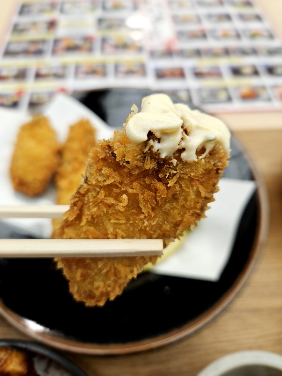 굴튀김 6개가 있고, 굴 껍데기에 타르타르와 케첩이 뿌려져 있다. 굴튀김은 알이 통통해 보인다. 굴 전문집이라는 것을 알고 나서는 생굴도 함께 나왔으면 좋았겠다는 생각이 들었다. 가격이 조금 더 비싸겠지만 여기까지 왔으니 한번 먹어보고 싶긴 했었다.