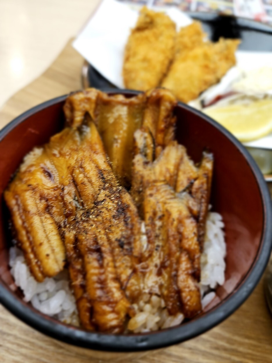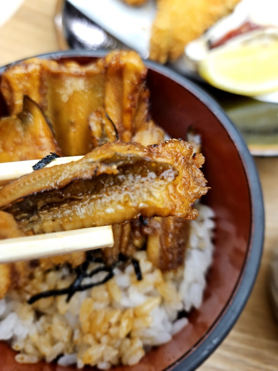 바닷장어 덮밥, 아나고 메시이다. 확실히, 민물장어 우나기가 아닌 바닷장어 아나고라서 좋게 이야기해서 좀 더 탱글 해 보인다. 5조각 정도 들어가 있다. 장어와 밥에는 달달한 소스가 적절히 뿌려져 있기도 하다.