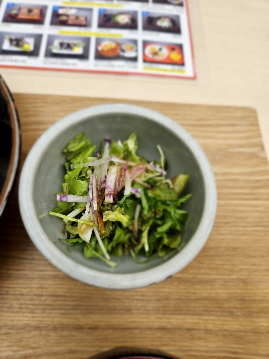샐러드와 된장국, 미소 지루. 된장국은 약간 싱거워 보이는 모양새였지만, 먹어보니 구수한 맛이 좋았고, 조개와 기타 재료들도 꽤 많이 들어가 있어서 훌륭했다.