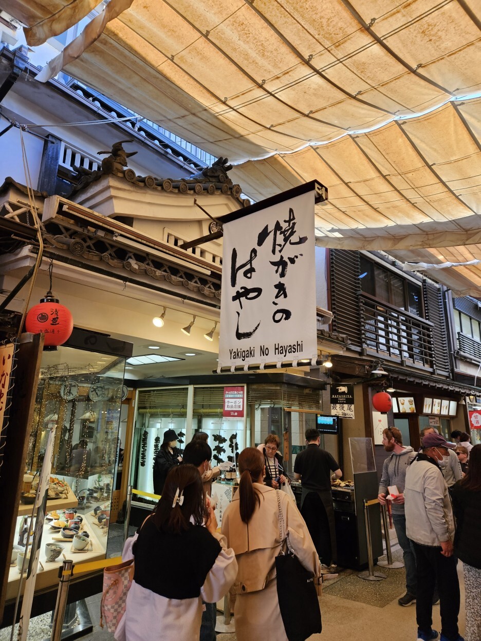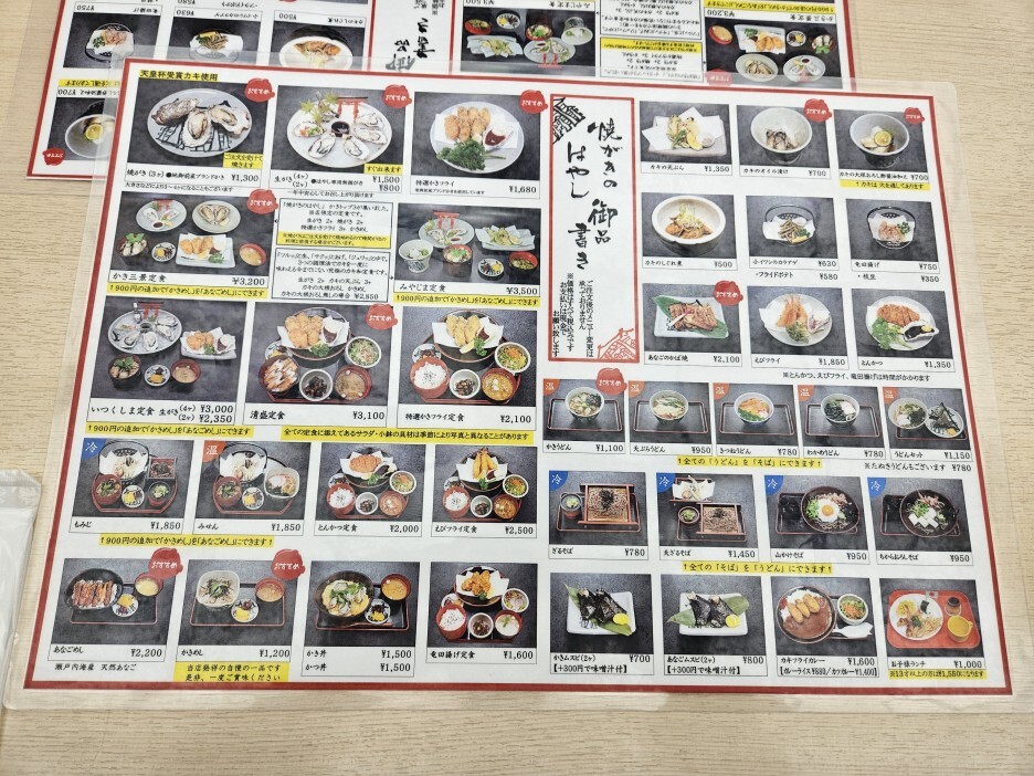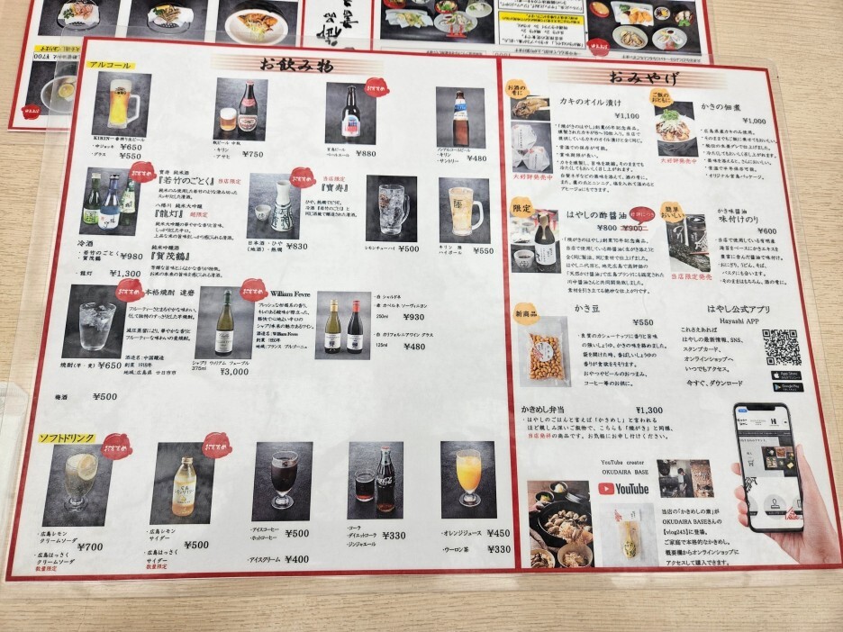 1948년에 개업하여 2023년 현재 75년이나 된, 노포인 굴 구이의 하야시. 일본 내에서는 최초로 굴 구이를 판매한 굴 구이의 발상지로 고급 히로시마산 '地御前牡蠣 지고젠 굴' 그 중에서도 특히 귀한 3년산을 사용한다고 한다. 지고젠 굴이 자라는 바다는 수온이 안정적이고 염분의 농도가 높아 1년 내내 생굴을 먹을 수 있다고 한다.