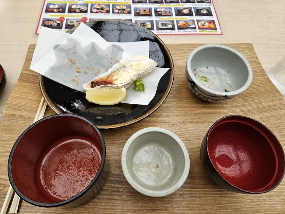 초토화된 그릇들. 배가 고팠기도 했지만 맛이 그만큼 좋았다는 것. 굴튀김도 훌륭했고, 바닷장어 덮밥은 양념이 아주 좋았다. 사실 가장 인상 깊었던 것은 굴 조림이긴 했지만. 여러모로 훌륭한 한 끼였다.