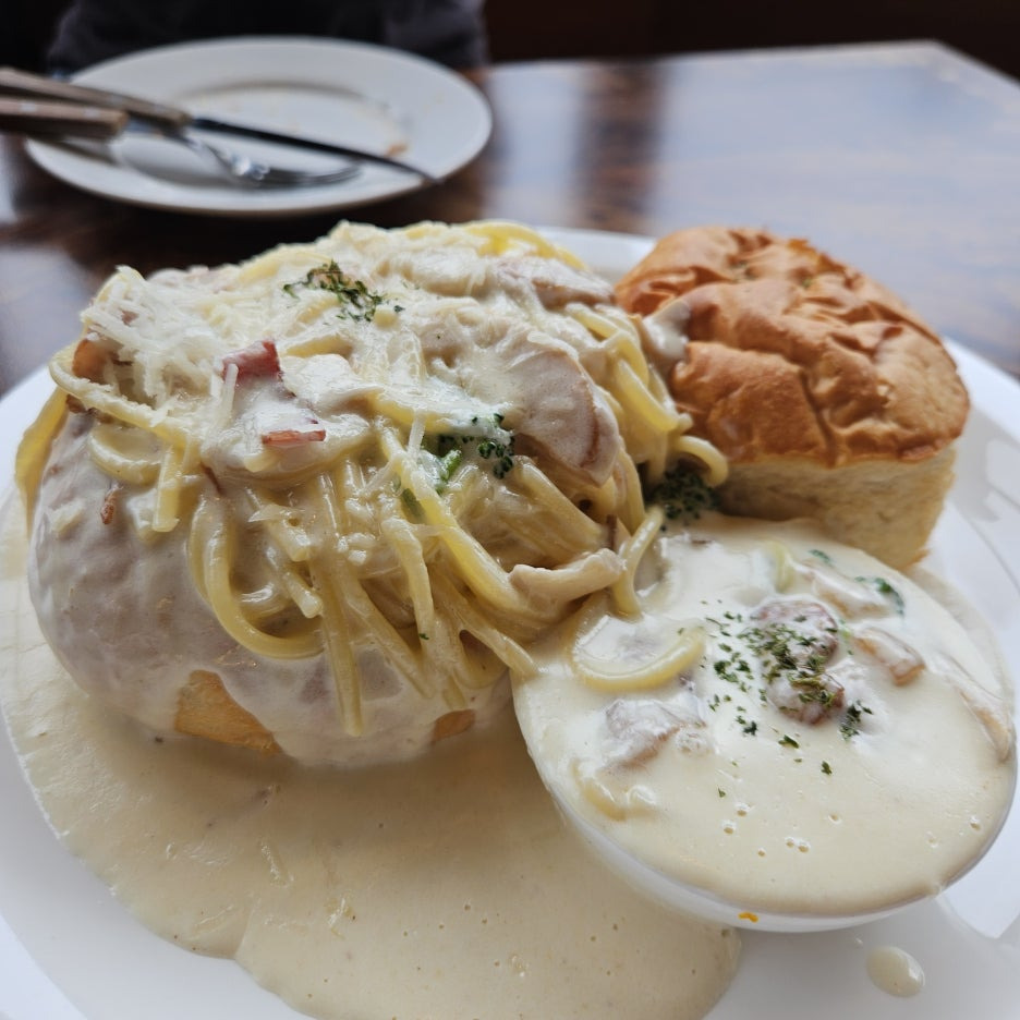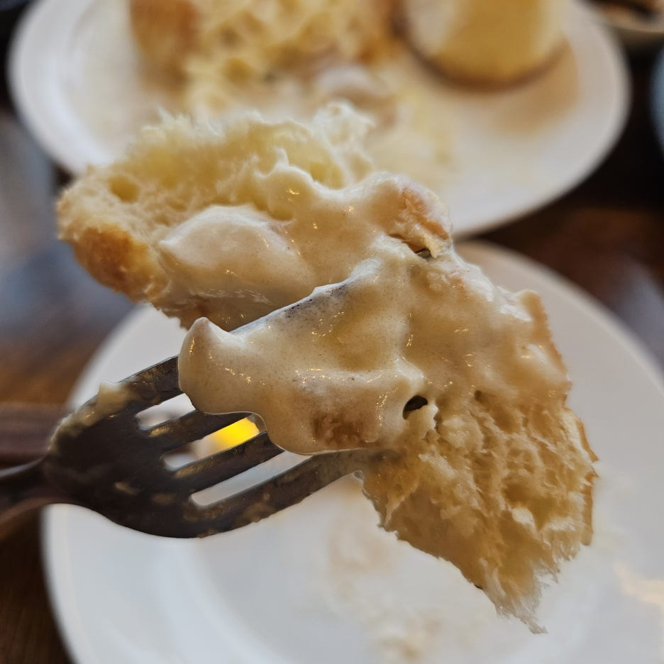 양이 상당히 푸짐하다. 이전에 자주 다니던 브런치 레스토랑에서는 파낸 빵 속은 따로 주지 않았는데, 여기는 빵을 다 준다. 좋다. 그리고 크림소스도 한 그릇 따로 더 주는 인정까지.