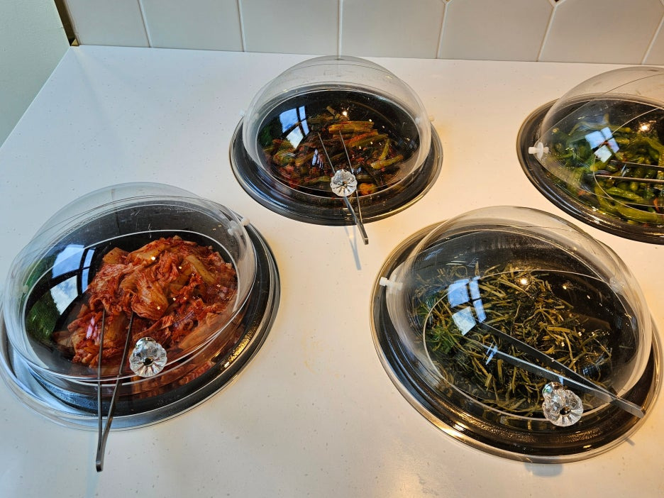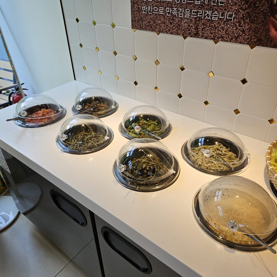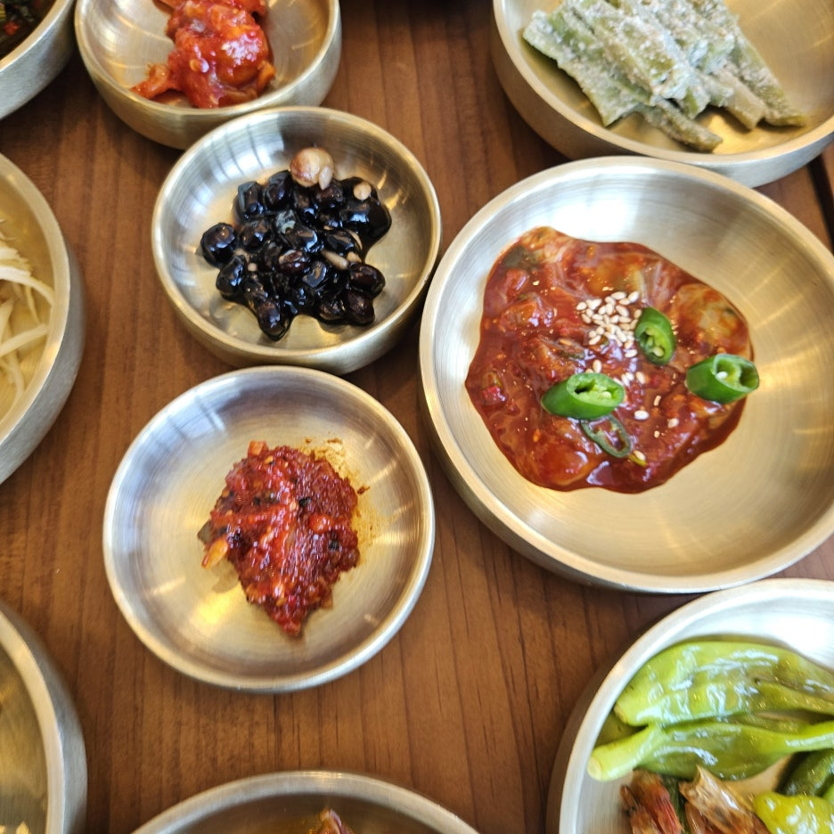 잠시 기다리니, 반찬들로 가득 차는 상. 셀프바에는 없던 반찬들도 보인다. 어리굴젓과 제육볶음, 콩자반, 무말랭이. 어리굴젓과 제육은 리필을 요청하면 따로 추가금이 발생된다고 한다. (어리굴젓 6천 원, 제육 7천 원)