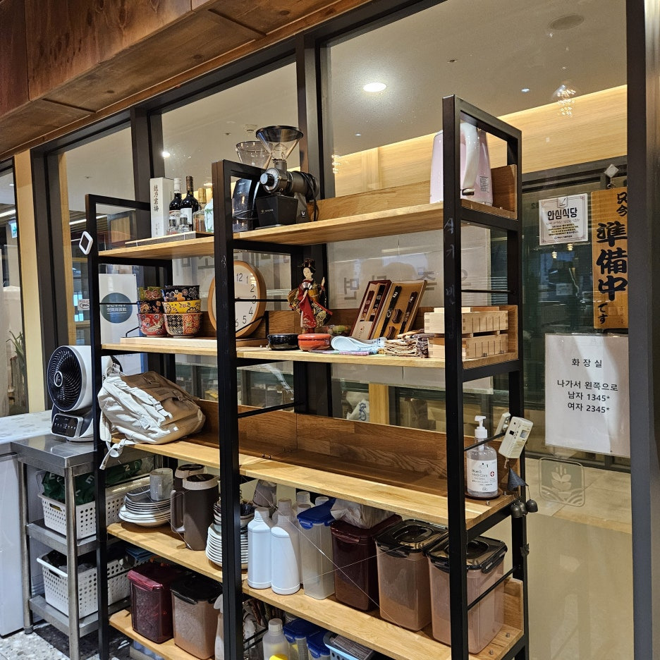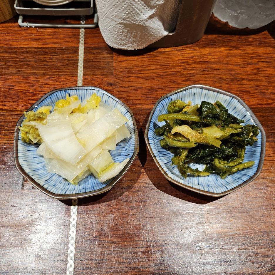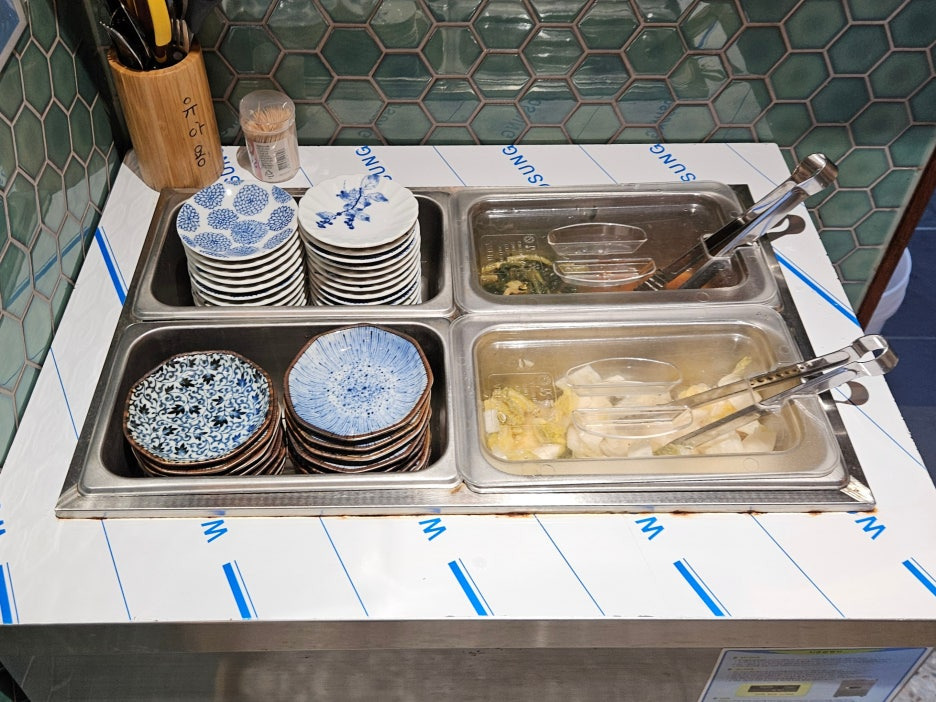 구석에 셀프서비스로 가져올 수 있는 반찬류가 있다. 보통 한국의 일본식 라멘집에는 단무지와 김치 또는 생강 절임 등이 있는 것이 보통인데, 여기는 특이하게, 열무김치와 백김치가 있었다.