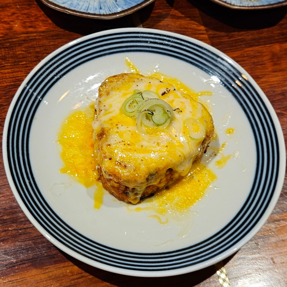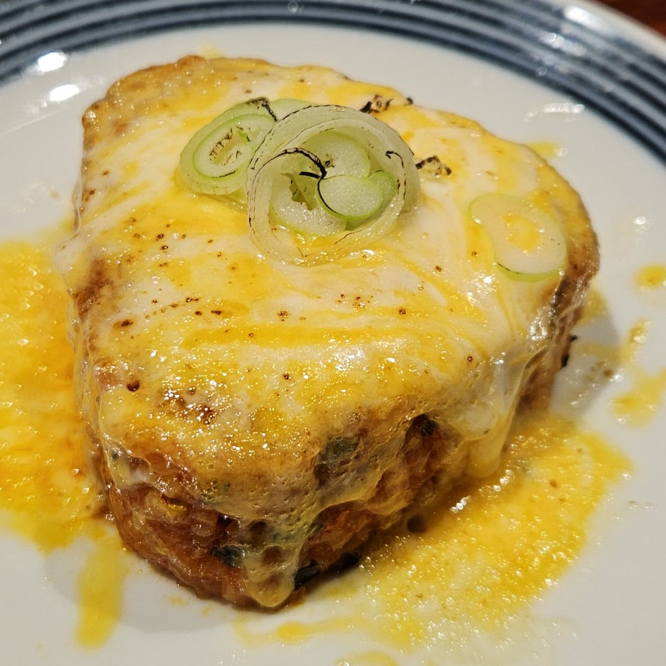 사실 이 메뉴는 따로 주문한 것은 아니다. 네이버 리뷰를 하면 서비스로 주는 여러 가지가 있길래, 리뷰를 작성하고 받은 서비스 메뉴. 삼각김밥 같은 형태의 밥에 파와 치즈가 듬뿍 올라간 토핑으로 고소한 냄새가 진동한다.