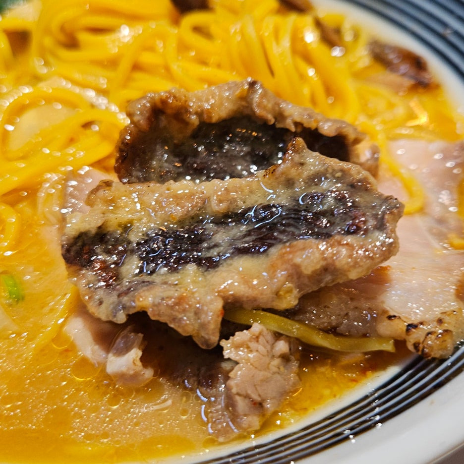 멘마라고 말하기에는 조금 투박한 죽순도 쫄깃하니 괜찮았다. 그런데 가장 맛있었던 토핑은 바로 그 옆에 있는 표고버섯을 가라아게 형태로 전분을 묻혀 튀긴 듯한 것이었다. 버섯이 맞는지 아닌지도 정확하지 않지만, 살짝 튀겨진 맛이 국물과 너무나 잘 어울렸다. 이것만 따로 팔아도 사 먹을 듯한 맛.