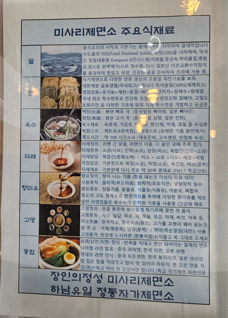 두 분이서 운영하는 매장이라, 모든 것은 셀프 시스템. 뭐 라멘집이니 크게 문제가 되는 부분은 아니다. 오히려 편하다. 그리고 라멘에 사용되는 재료와 용어 대해 아주 자세하게 설명을 해둔 표도 있었다. 재료는 거의 다 국내산 재료로 만드신다고 한다.