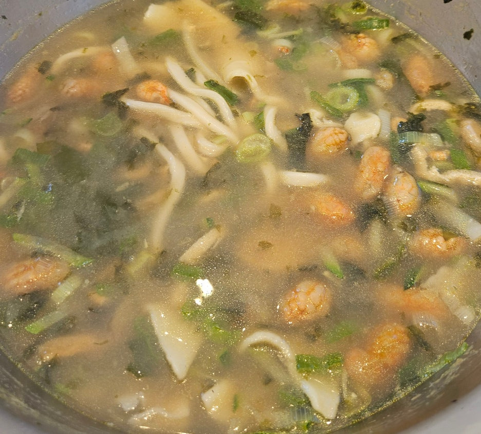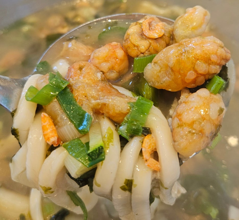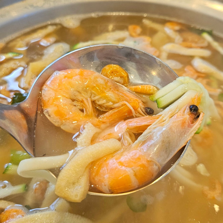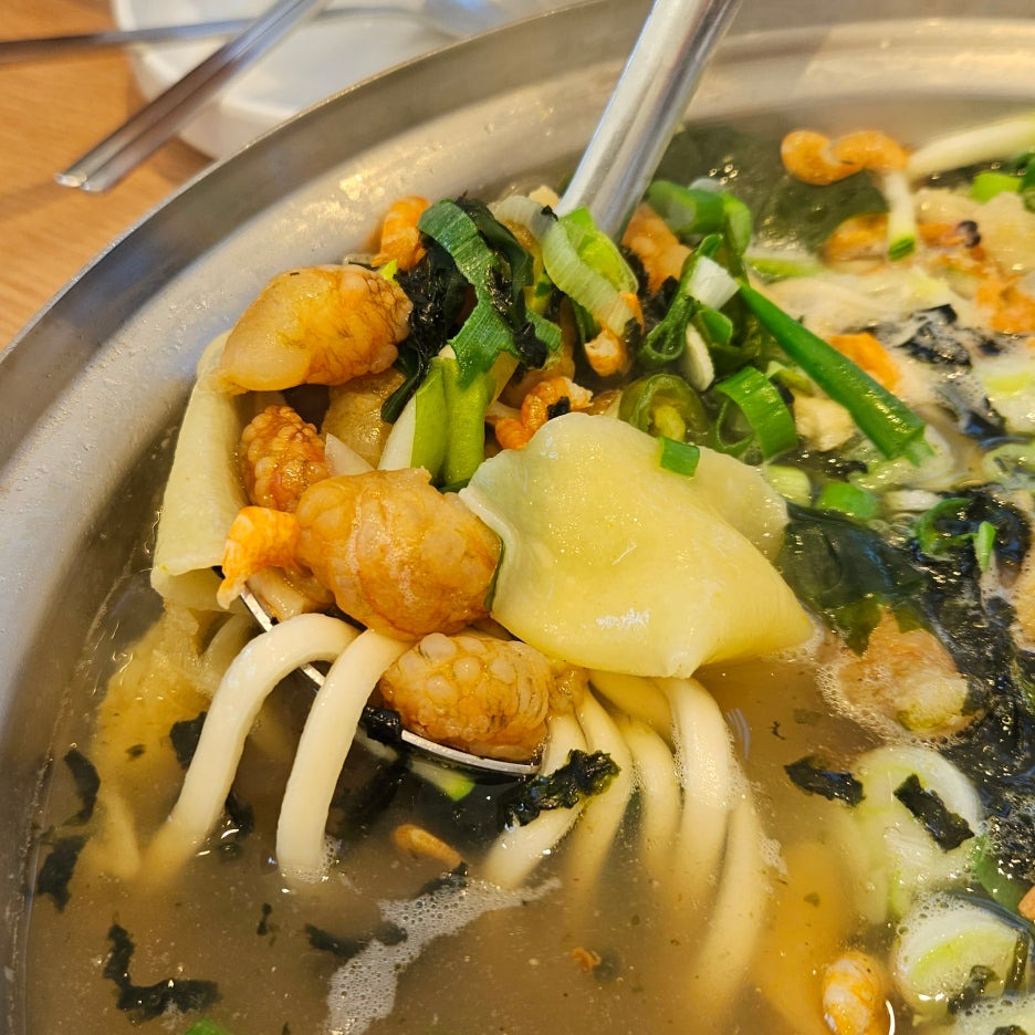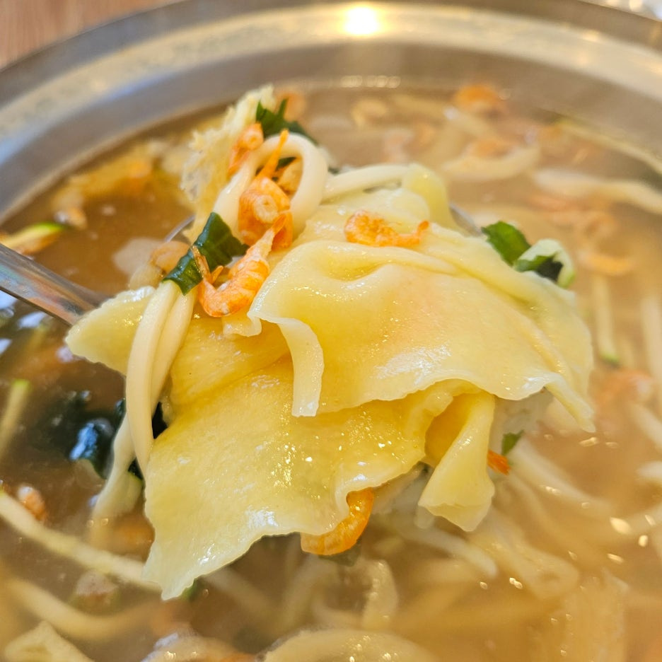 살짝 국자로 떠보니, 내용물이 많이 딸려 올라왔다. 특히 눈에 띄는 것이 건새우와 수제비.