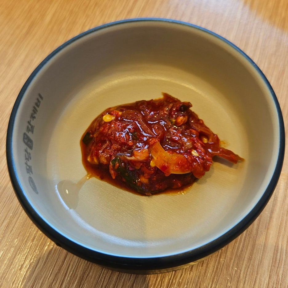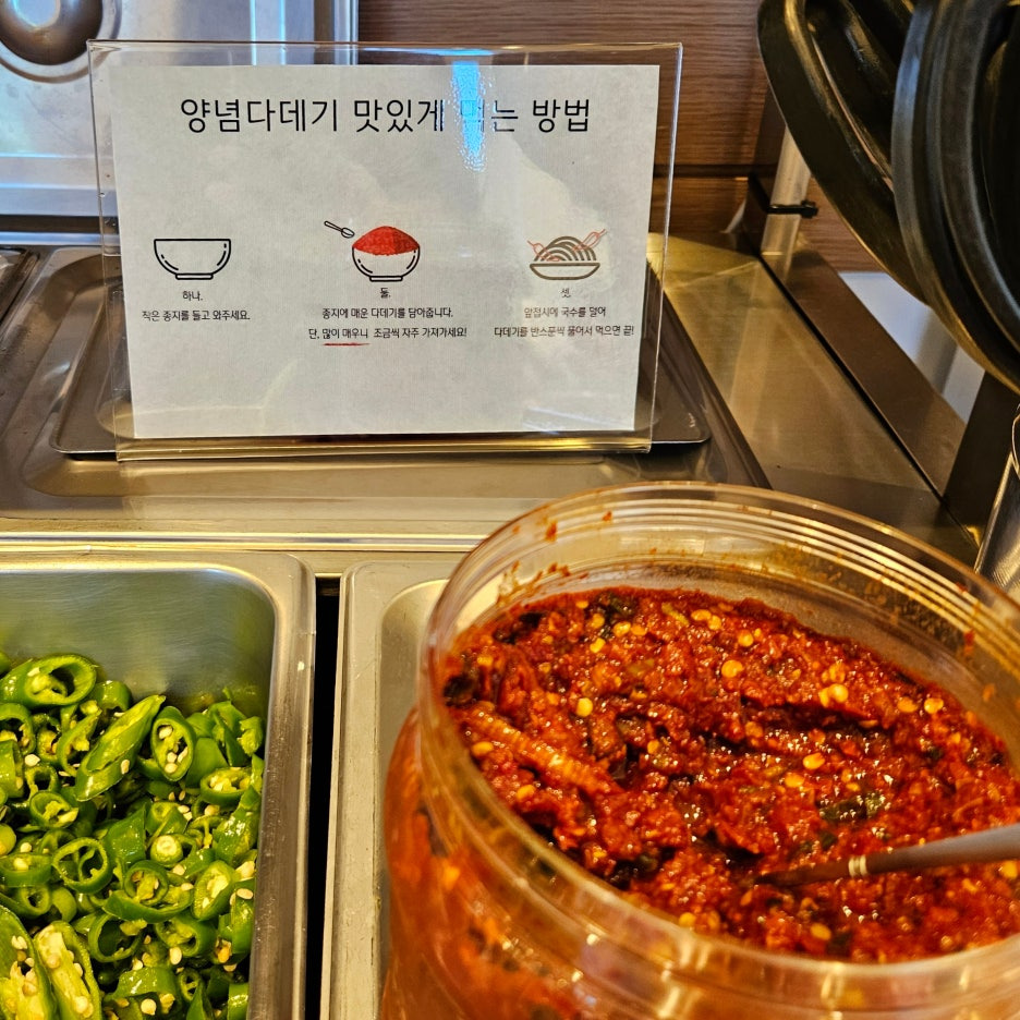 창모루는 고춧가루가 따로 준비되어 있었는데, 여기는 조금 고급스럽게 다데기가 있다. 조금 가져오려고 하니, 직원분께서 "아주 매운 다데기니 조금씩 드세요"라고 말씀하신다. 실제로 먹어 보니 좀 맵긴 했지만 맵찔이인 나도 충분히 먹기에 어렵지는 않았던 맵기 정도였다.