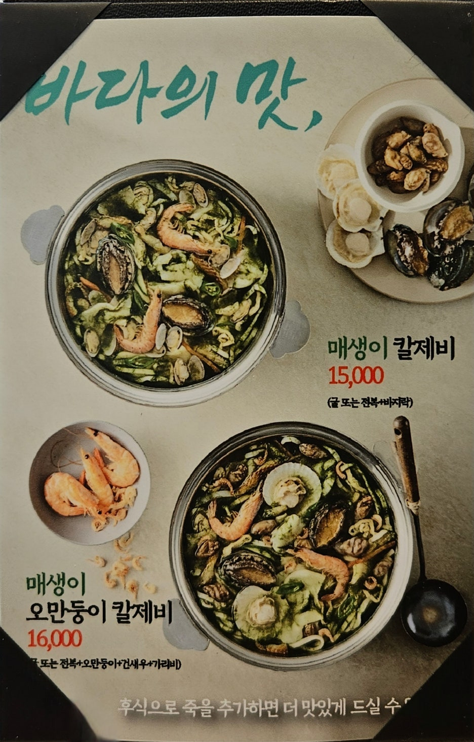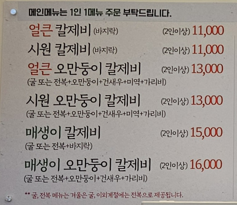 메뉴는 기본적으로 칼제비. 그것의 얼큰 버전으로 나눠지고, 오만둥이와 매생이가 들어간 버전으로 나눠진다. 창모루에 비해서 조금 더 다양한 메뉴였다. 칼국수로만으로는 먹을 수 없었던 것이 또 다른 점.