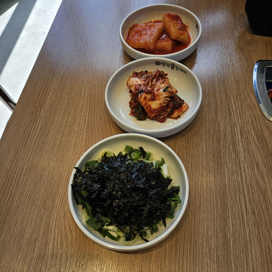 추가 반찬 셀프바에서 가져오면 된다. 김치, 섞박지, 단무지, 파, 고추, 양념 다데기가 있었다. 김은 추가로 비용을 지불해서 주문을 해야 했었다.