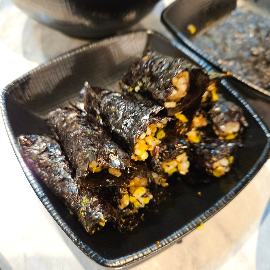 잘 비비고, 기본 찬으로 나오는 구운 김으로 잘 말아주면 주먹밥이 아닌, 날치알 김밥으로 완성.
