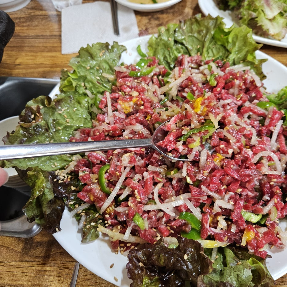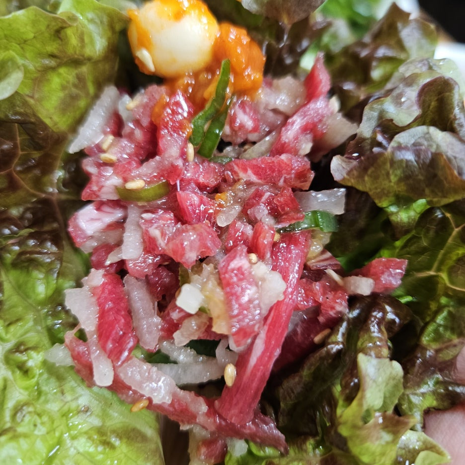 소주 안주로는 조금 더 여러가지 맛을 더해서 먹으면 좋다. 상추에 육회 한젓가락을 올리고, 마늘과 쌈장까지.