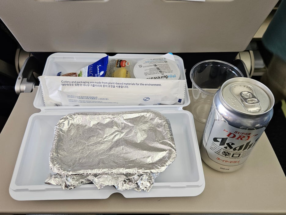 언제나 즐거운 기내식 타임. 비행시간이 짧다 보니, 벨트 사인이 꺼지고 바로 배식이 시작된다. 한 가지 메뉴만 준비가 되어 있어 음식을 고를 수는 없었다. 작년 12월에 대한항공을 타고 거의 10개월 만에 타서 그런지, 기내식의 준비된 모습이 바뀌어 있었다. 아침이지만 카트에 놓여 있는 맥주를 보니, 안 먹을 수가 없어 음료는 맥주로 신청.
