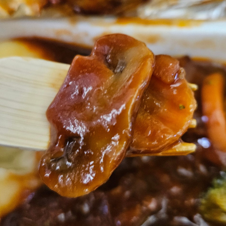 버섯을 비롯해 다양한 구운 야채도 함께 한다. 당근, 양파 등등.