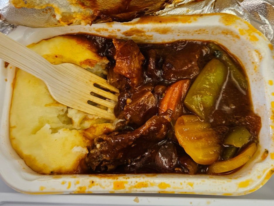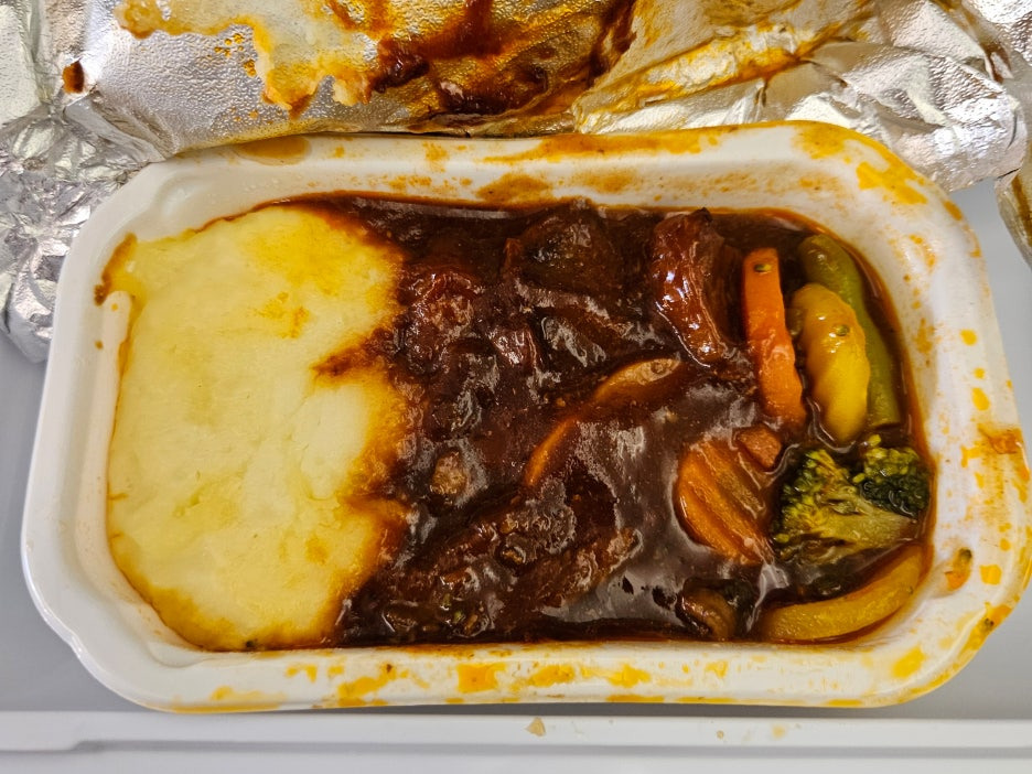 감자는 포슬포슬. 고기는 질기지 않고 꽤 부드러웠다. 물론 구운 고기의 느낌은 아니고 찐 고기의 식감과 맛. 소스는 달달하니 잘 어울렸다. 간만에 괜찮은 기내식을 먹은 듯. 감자의 식감을 별로 좋아하지 않아, 감자 자체를 썩 좋아하지는 않는데 데미그라소스와 함께 먹으니 꽤 맛있었다.
