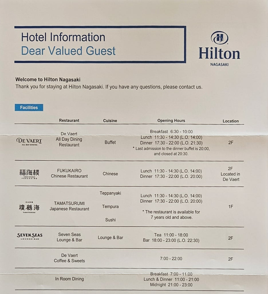 구글맵과 힐튼 호텔 홈페이지의 안내에는 조식 시작 시간이 7시로 되어 있지만, 내가 직접 받은 안내서에는 6시 30분부터 10시까지 조식을 먹을 수 있다고 되어 있었다.