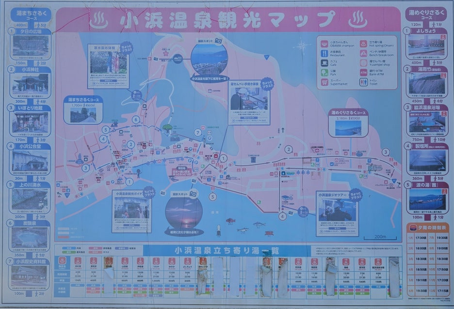 시마바라 반도 서쪽에 위치한 오바마 온천은 약 1,300년의 역사를 지닌 유서 깊은 해변 온천 마을. 바다를 바로 맞닿아 있어 아름다운 석양 조망으로 유명하다. 해변을 따라 길이 105m의 일본 최장 족탕(足湯)이 있어, 다치바나만을 바라보며 여유롭게 족욕을 즐길 수 있는 명소. 이 족탕 근처에는 고온의 온천 증기를 이용해 해산물이나 채소 등 제철 식재료를 쪄 먹을 수 있는 무시가마(찜 가마) 시설이 있다. 인근에서 식재료를 구입해 직접 쪄 먹는 독특한 체험을 할 수 있다고 한다.