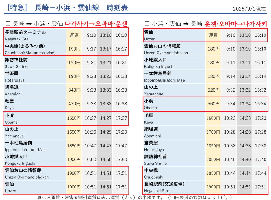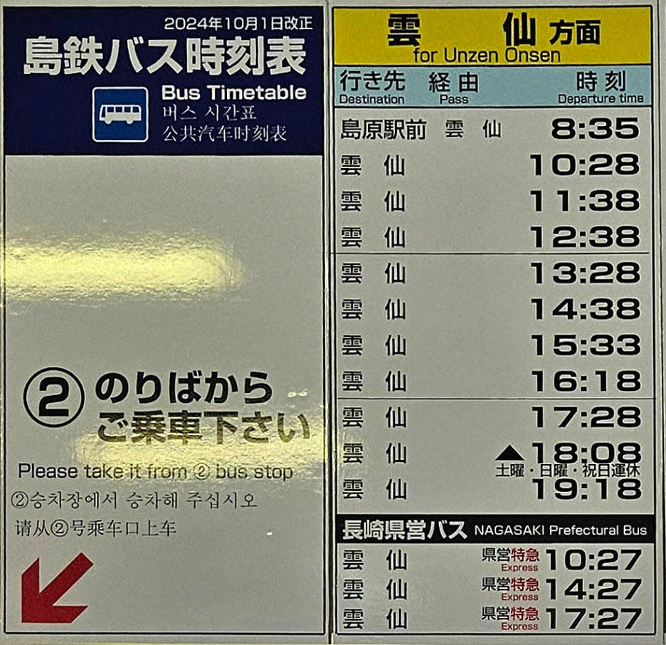 나가사키 역에서 출발하는 운젠행은 09:10, 13:10, 16:10 이렇게 3번만 있고, 돌아오는 것도 운젠에서 9:10, 13:10, 16:10 3번만 있다. 나가사키 역 출발은 나가사키 현영 버스터미널에서 출발하고, 시내에서 승차하려면 쥬오바시 정류장에서 탑승이 가능하다.