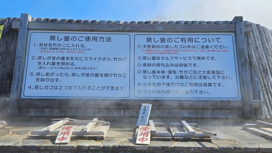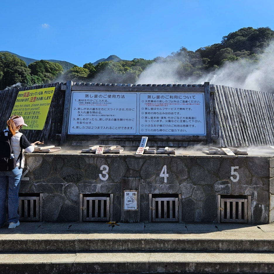족욕장 바로 옆에는 엄청난 김을 내뿜는 대형 찜가마가 있다. 많은 사람들이 찜가마를 이용해서 쪄진 음식들을 먹고 있었다.
