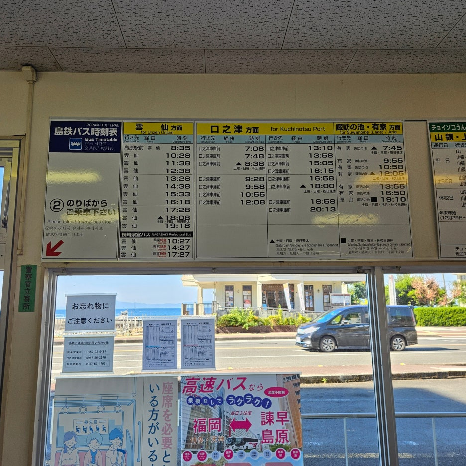 앞서 설명을 잠시 했지만, 오바마에서 운젠을 대중교통으로 가려면, 1시간에 1대 정도 있는 버스를 이용해야 한다. 터미널에 들어가면 시간표가 양쪽 벽에 붙어 있는데, 운젠(雲仙) 이라고 적혀있는 시간표를 확인하면 된다.