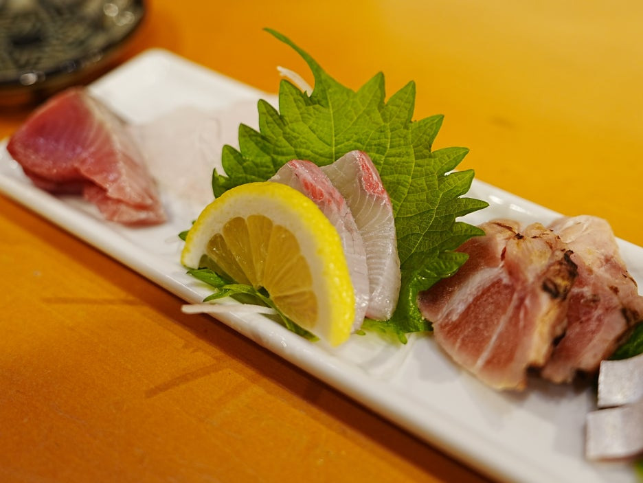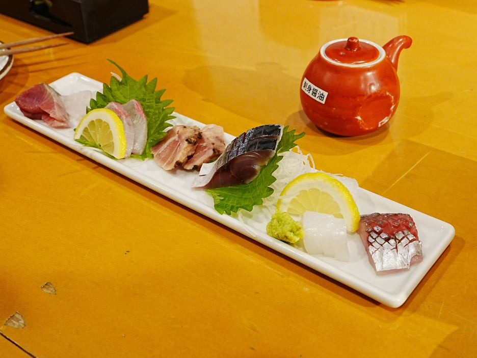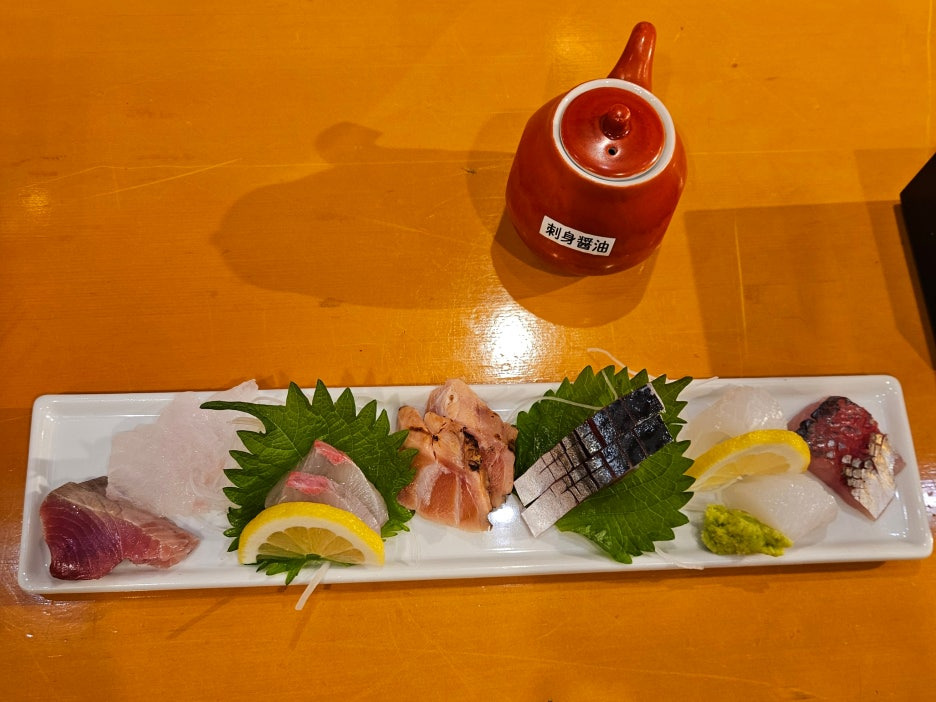 나가사키에서 잡은 생선의 사시미 모둠. 6가지 다른 생선으로 나왔다. 1인분 1100엔인데 2인분으로 주문했다.