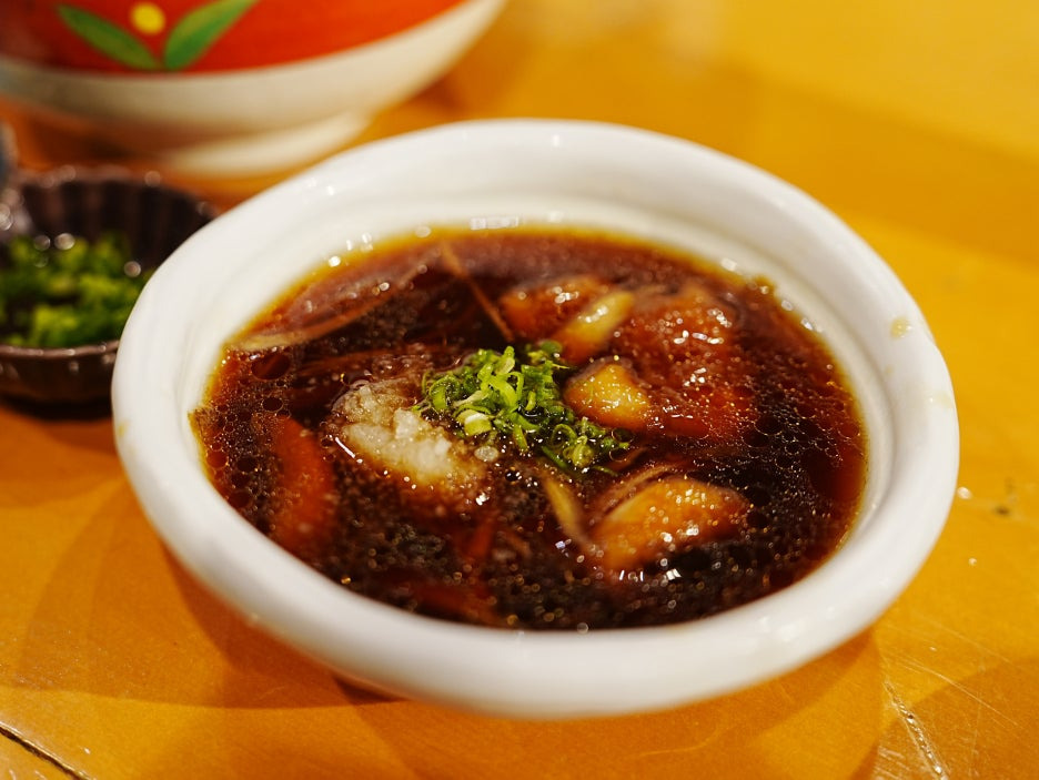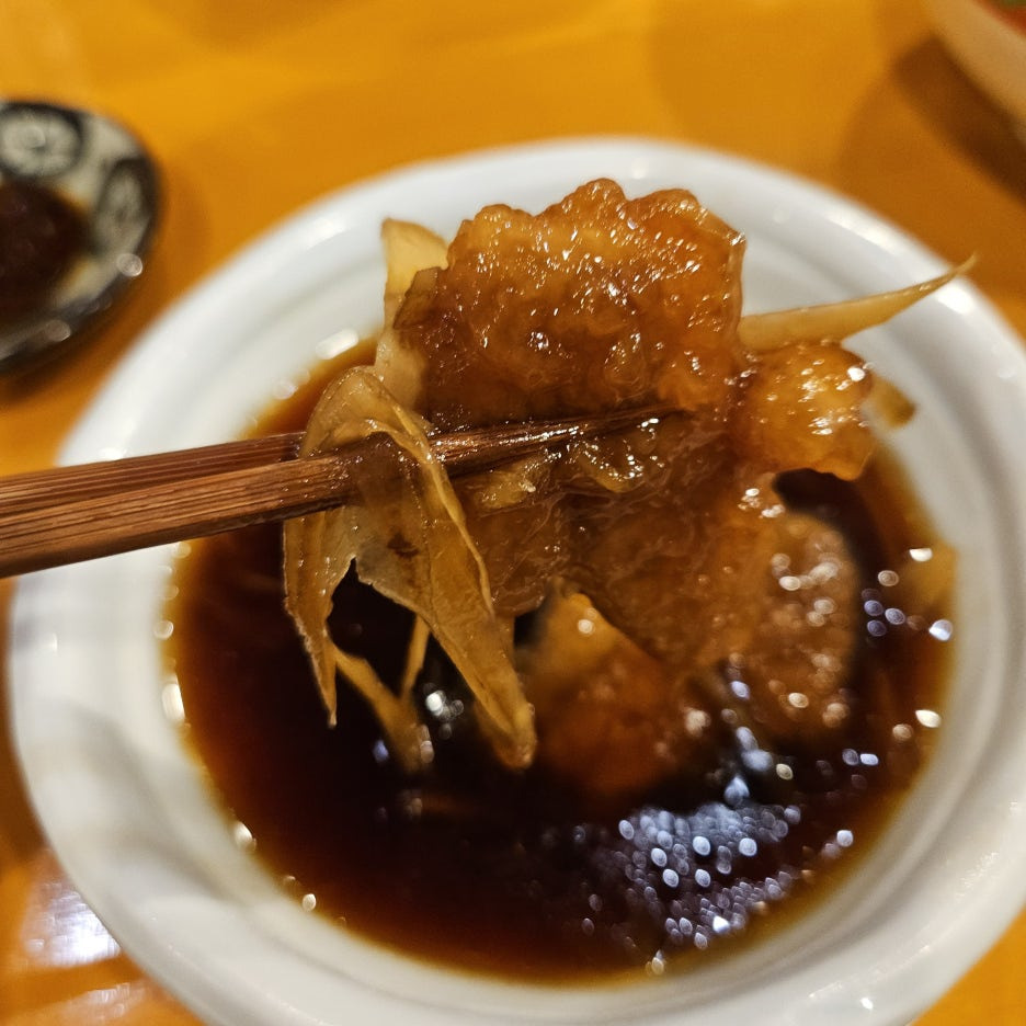 "규스지 다이콘 牛すじ大根" 일본의 어디에서나 먹을 수 있는 메뉴이긴 하지만, 우리는 소 힘줄 스지를 상당히 좋아해서 주문해 보았다. 맛있는 스지는 질기다기보다는 푹 삶아져서 부드러운 식감이 더 좋은 재료.