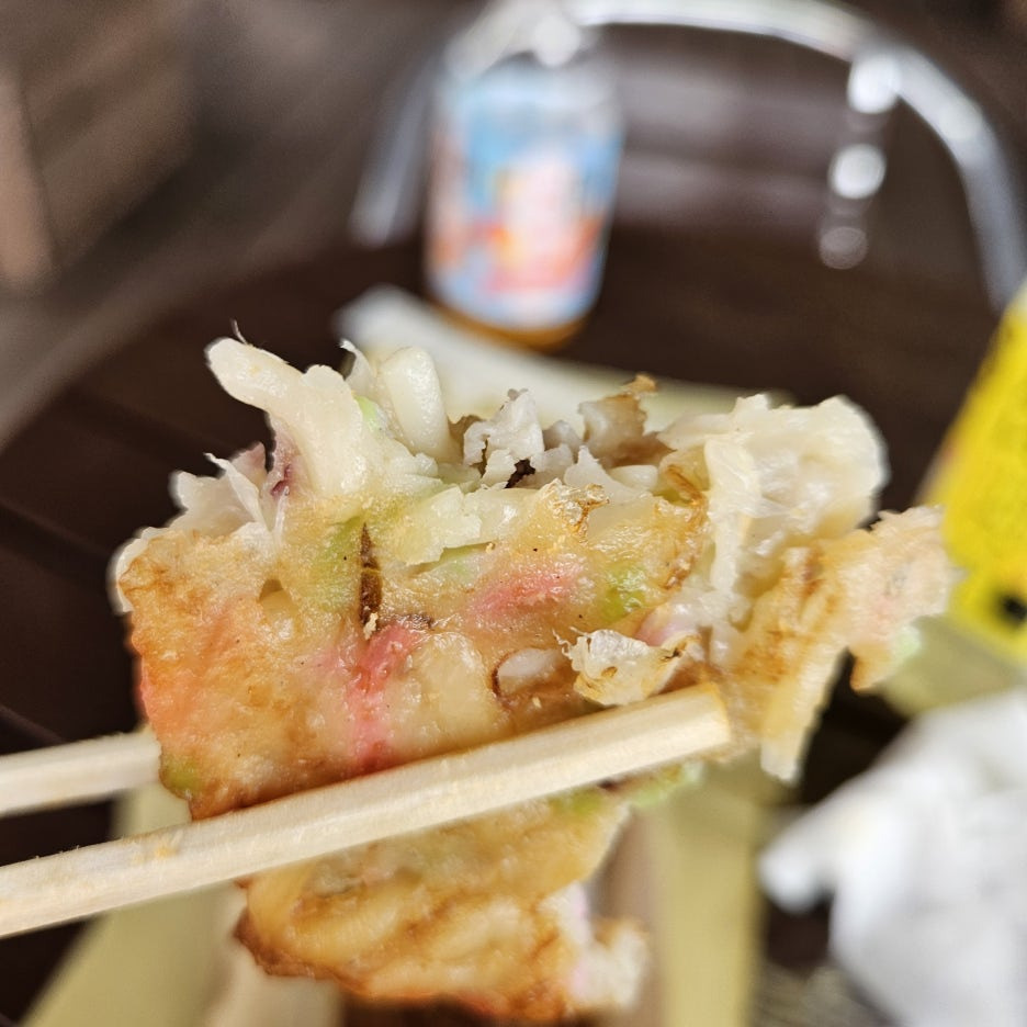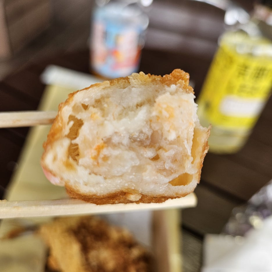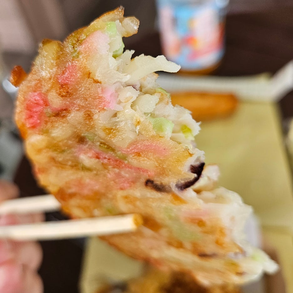 반으로 자르다 보니, 확실하게 보이는 짬뽕면. 그리고, 분홍색의 가마보코도 들어가 있고, 완전히 나가사키 짬뽕을 그대로 어묵과 함께 튀긴 느낌이었다. 이거 왠지 기대된다.