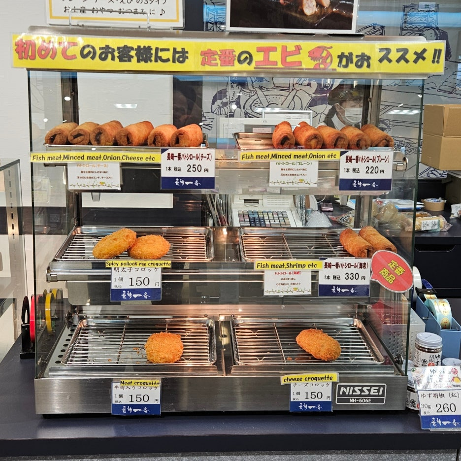 나가사키 명물인 하토시가 3종류. 플레인, 치즈, 새우 이렇게 준비되어 있었고, 덩치에 비해 가격도 나쁘지 않다. 거기에 고로케도 3가지 종류가 있다. 명란 고로케, 고기 고로, 치즈 고로케까지. 전부 따뜻하게 보관되고 있어서 바로 먹기에도 좋다. 아무래도 나가사키 이치반은 하토시가 유명한 곳이도 하고, 여기는 나가사키이니 고로케 보다는 하토시를 선택하는 것이 더 좋을 듯.