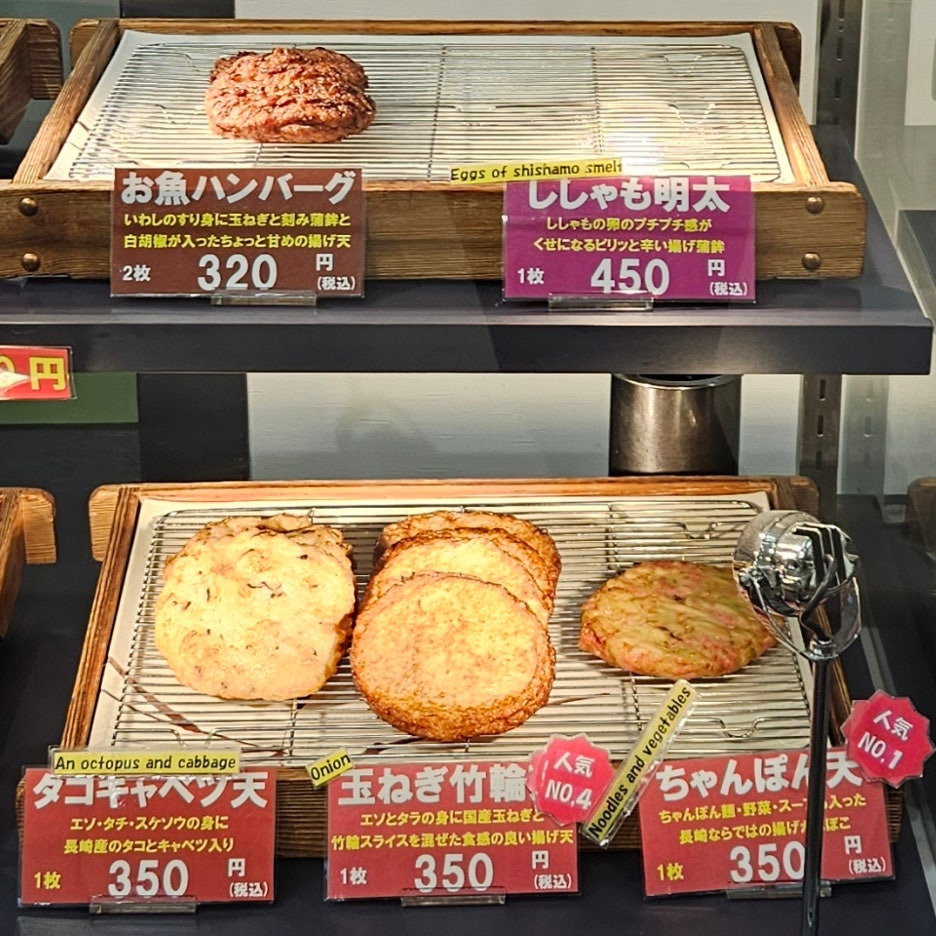 위쪽은 생선 함박(정어리살과 다진 가마보코, 양파, 백후추), 시샤모 알 어묵(전시품 없음). 아래쪽은 문어 양배추 어묵 튀김, 양파 치쿠와 튀김, 짬뽕 어묵 튀김. 짬뽕 어묵이라는 녀석이 아주 요상스러웠다.