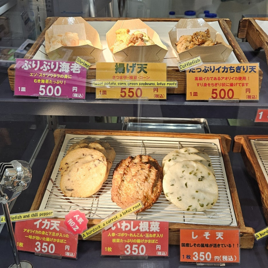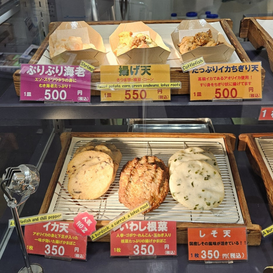 위쪽은 물건은 없었지만, 샛줄멸 참깨 튀김, 전갱이 튀김. 하지만, 전갱이 튀김을 요청했더니 주방에서 방금 튀긴 것을 주셨다. 전시된 것이 없더라도 요청하면 다 만들어 주시더라. 아래쪽은 야채 어묵, 생강 어묵, 전갱이 어묵.