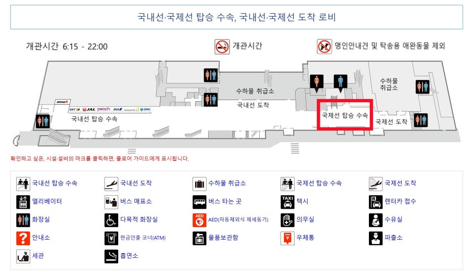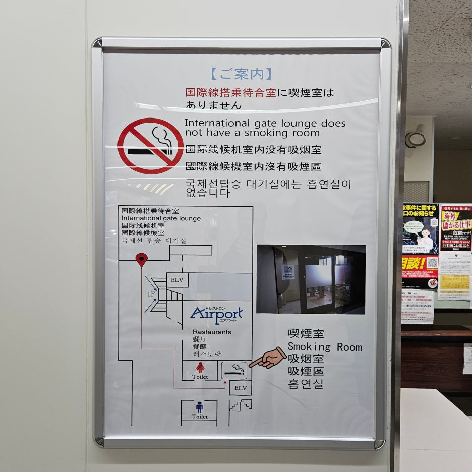 흡연자분들은 출국 수속을 하기 전에 마지막 한 개비 하시는 게 좋을 듯. 국제선 게이트 쪽은 흡연실이 없다고 한다.