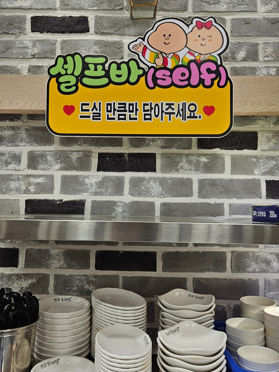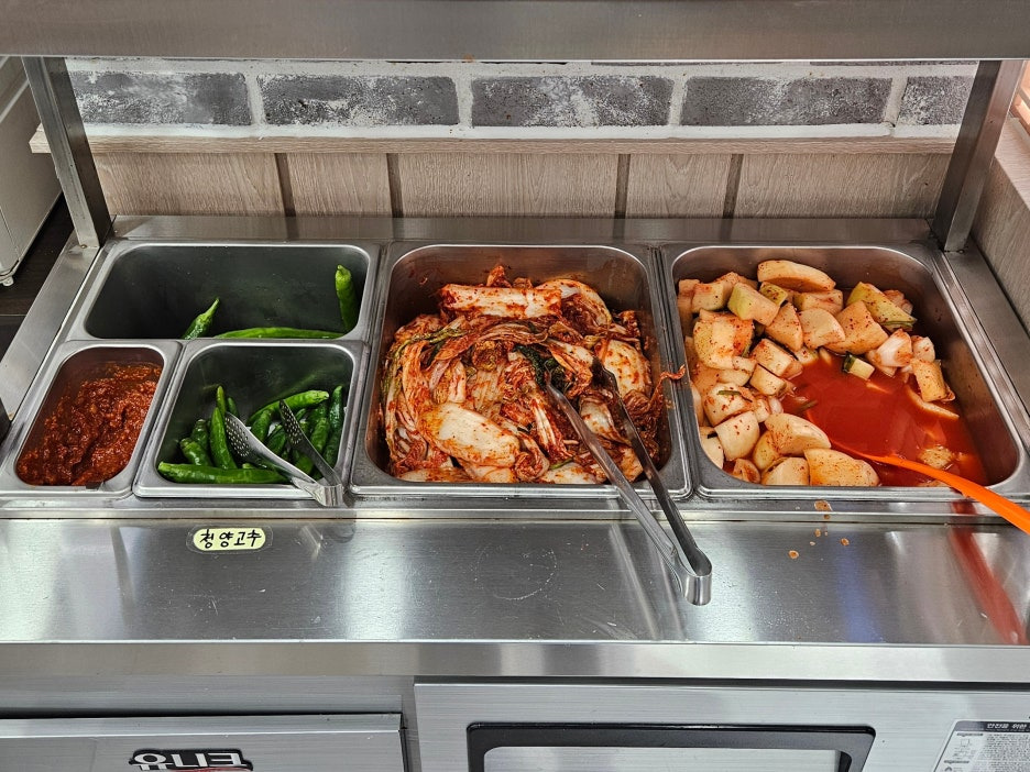 편리한 셀프바. 김치, 깍두기를 비롯해서 청양고추와 아삭이 고추까지. 두 번 먹어본 소감으로는 깍두기보단 김치가 훨씬 맛있었던 기억.