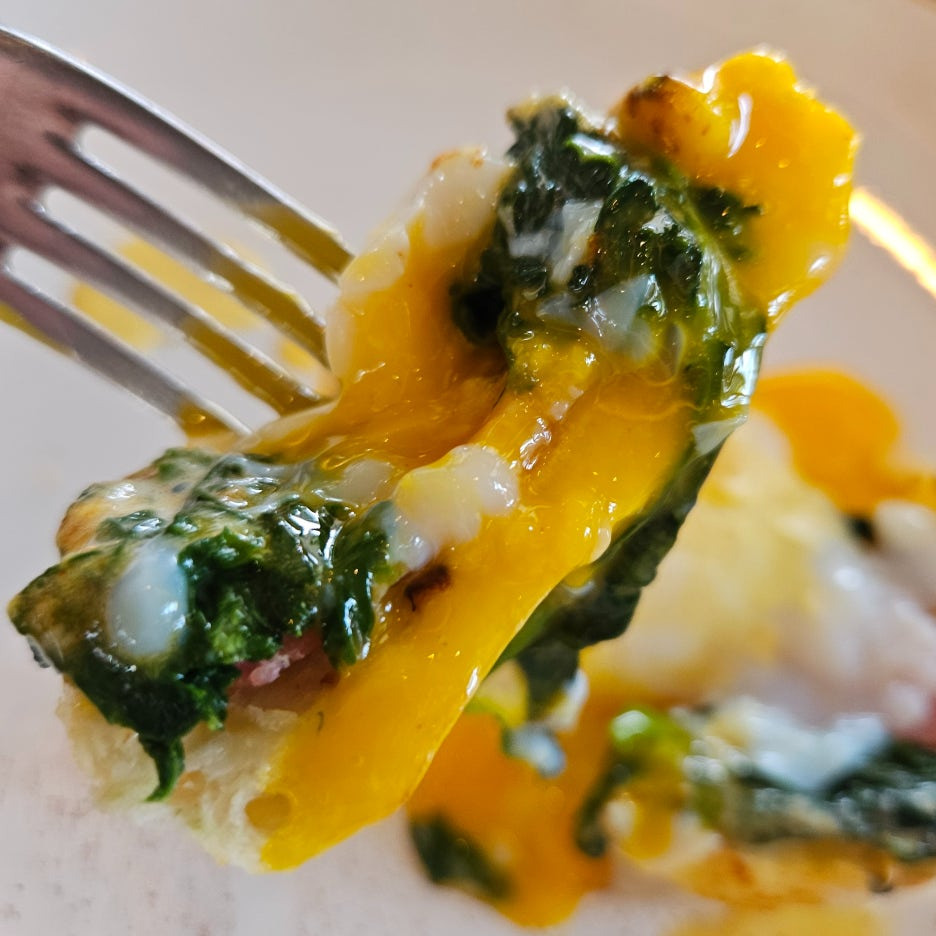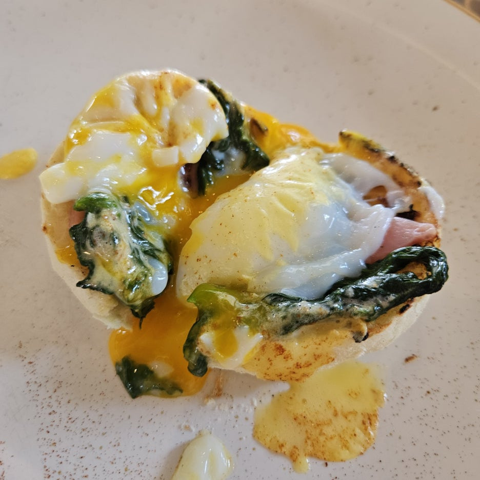 수란, 시금치, 햄의 조합. 거기에 다양한 소스.