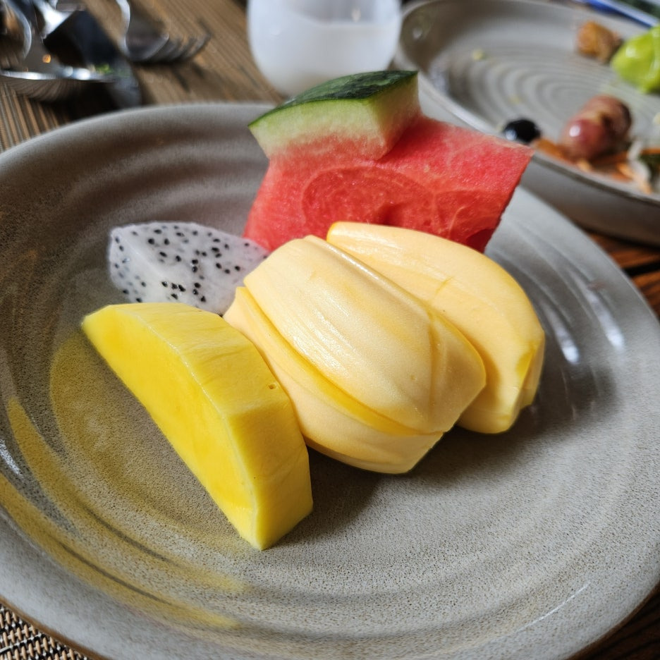 잠시 쉬어가는 과일 접시. 고급스러움이 묻어나는 모습이다. 아내분이 극찬을 한 잭 플룻과 망고. 아주 신선하고 달았다.