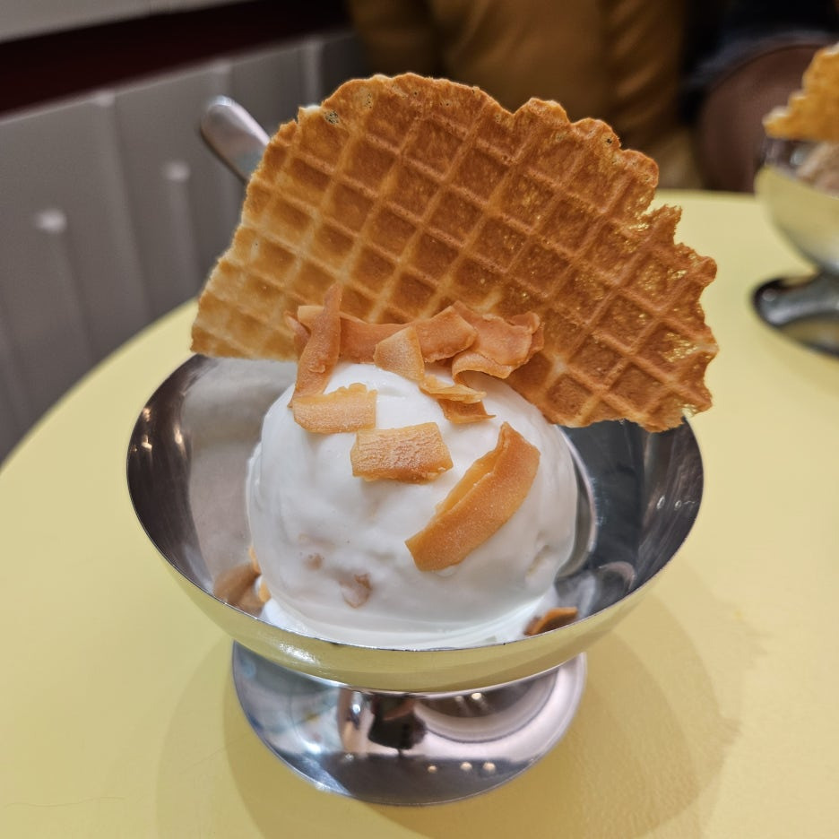새하얀 모습의 젤라또. 구운 코코넛 칩이 토핑으로 올라가 있었다.