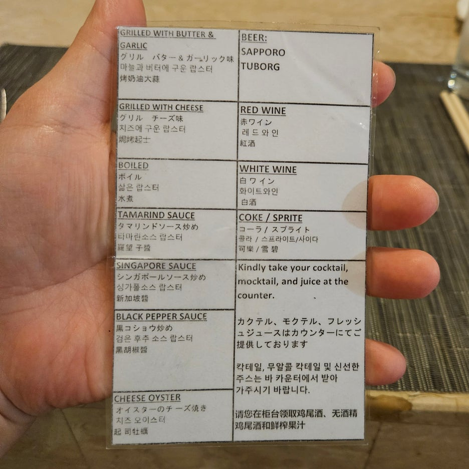 직원분이 주문할 수 있는 메뉴를 가져다준다. 6가지의 랍스터와 굴을 주문할 수 있다. 모든 손님이 한 번에 주문을 하니 음식이 나올 때까지 시간이 꽤 걸릴 수 있고, 주문이 빠지거나 할 수도 있다. 그러니 처음에는 모든 메뉴를 한 번에 주문하는 것이 팁. 실제로 몇몇 메뉴는 주문을 했지만 나오지 않은 경우도 있었다. 주류와 음료도 주문하면 된다.