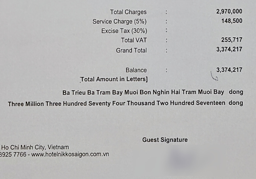 투숙객 할인 10%를 받은 2명의 금액은 3,374,217동. 약 189,000원으로 1인당 거의 9만 5천 원의 가격이다.