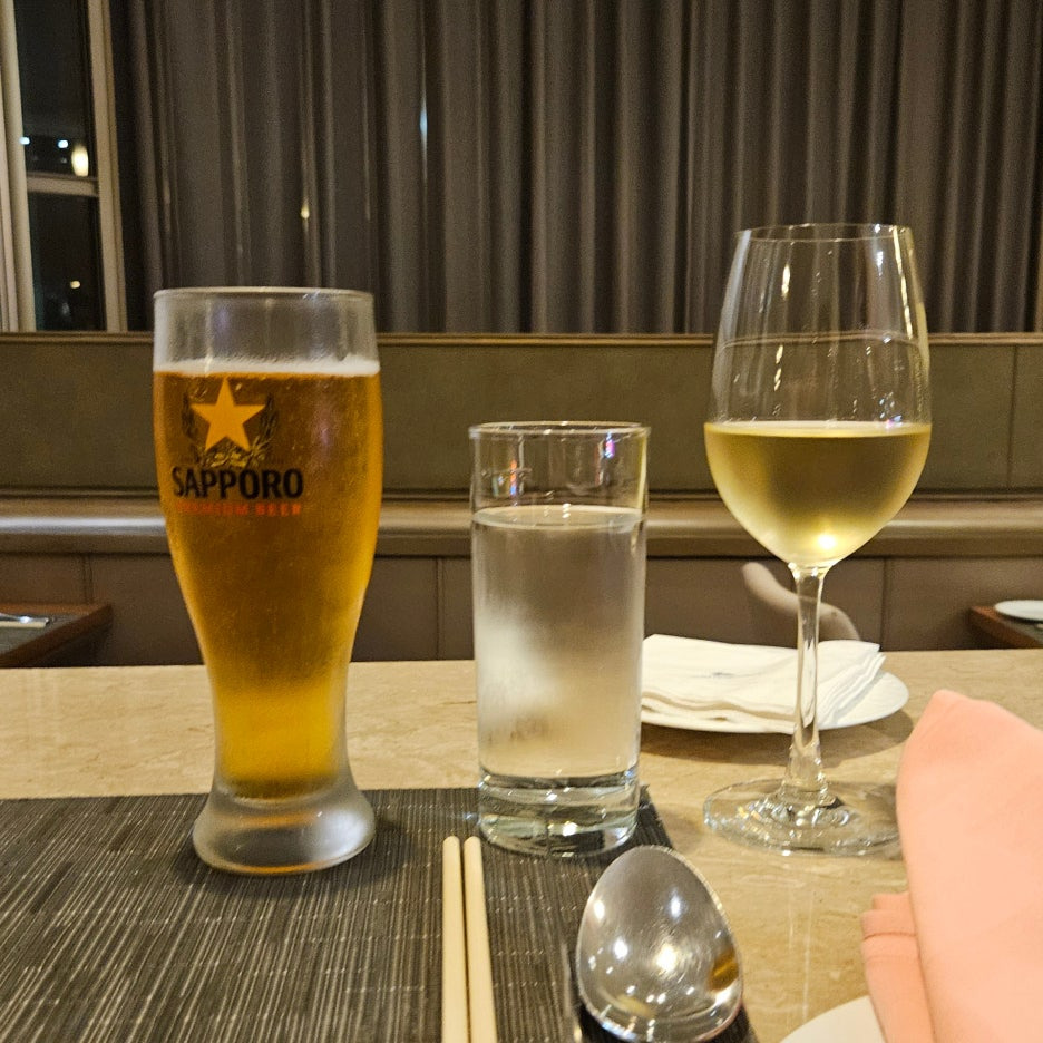 먼저, 준비된 맥주와 와인. 맥주는 삿포로 생맥주가 있어서 좋았다. 와인은 드라이한데 괜찮은 맛. 직원분들이 아주 친절하시게도 와인 잔이 비면 바로바로 채워주어서 아주 정말 취할 뻔. 맥주는 직원분께 요청을 하면 시원한 맥주로 리필해 준다.